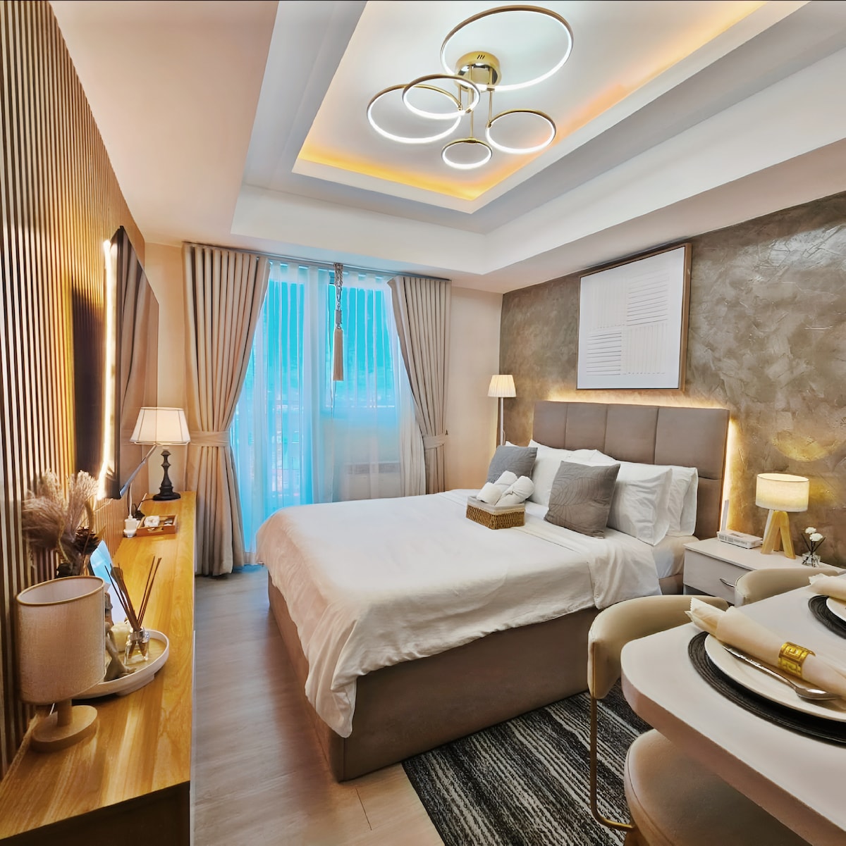 Romantic Hotel-like Staycation in Pampanga 😱 + Big Jacuzzi w/ Cinema, 2 bedrooms, Smart TV, Fully Equipped Kitchen, Luxurious Interior, Etc.. Parang nasa loob talaga kayo ng hotel room dito mga vevs! Grabe yung interiors nila and kumpleto na rin sa gamit. Pero syempre ang WINNER ay yung Jacuzzi!!! Ang laki niyan and comfy rin kahit dalawa pa kayo sa loob. May jet massage at waterfall pa na feature. PERFECT! 😍