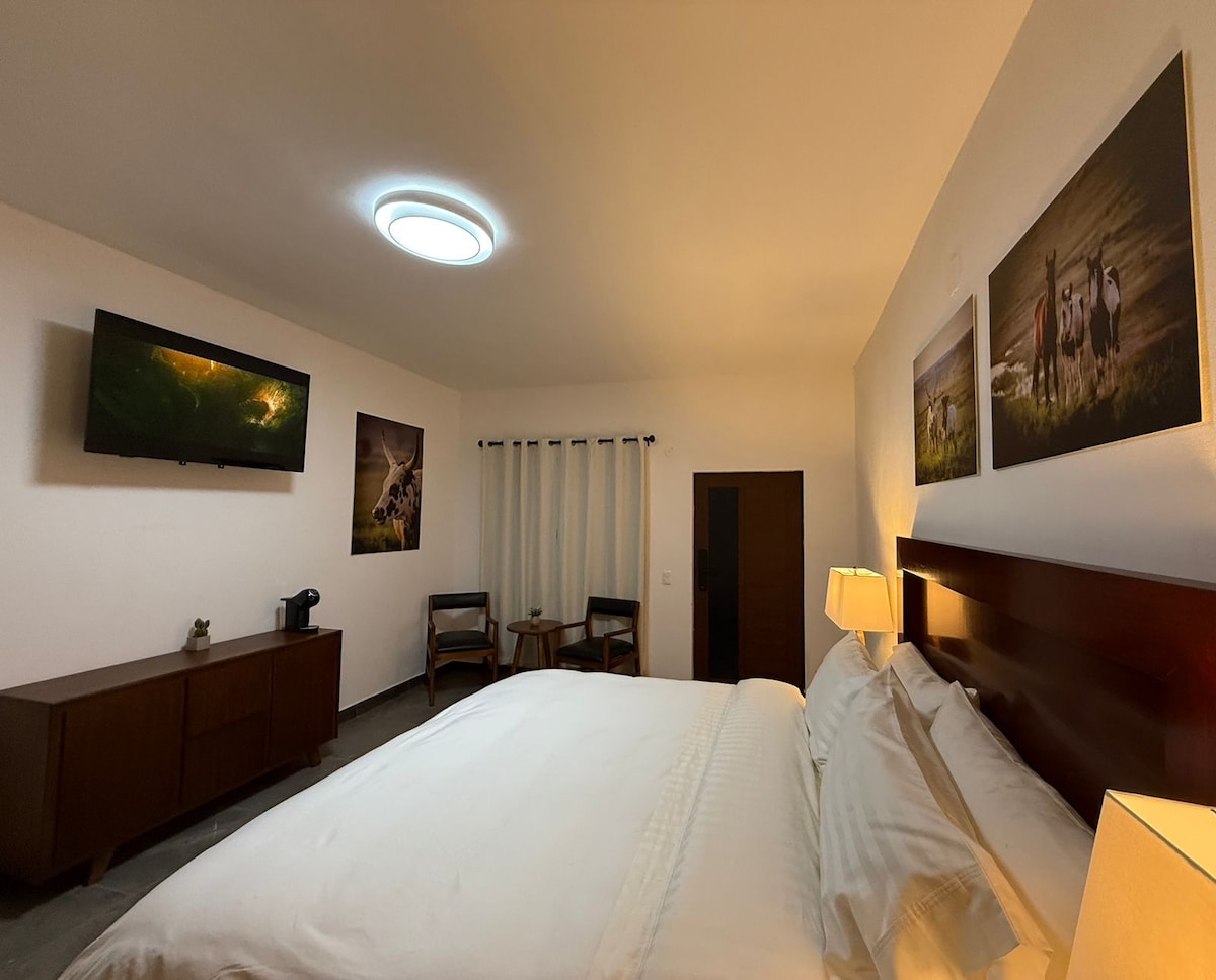 Enjoy a unique experience at Hotel San Fernando, located atop Cuquío with 360° panoramic views of the reservoir, the town, and the mountains. Our room features a comfortable bed, private bathroom, free Wi-Fi, flat-screen TV, and a coffee maker. Relax while admiring breathtaking sunrises and sunsets in a serene setting, perfect for connecting with nature and local traditions.