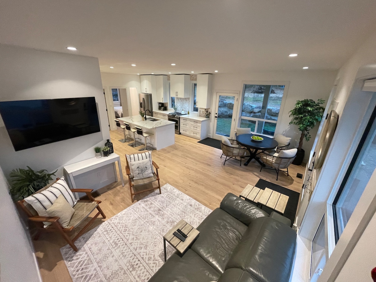 Step Inn Stones is a delightful, private entry suite located in the quaint Historical Village of Cowichan Bay, BC. Located on a no-through road above the village with a beautiful ocean view for a tranquil getaway, we are a five-minute walk to fine dining, shops, pubs, marinas and more. Our newly renovated suite has a small kitchenette, bar counter with a view, new comfy queen sized bed, seating for relaxing, reading and TV watching and a bathroom with heated floors and a rain head shower.