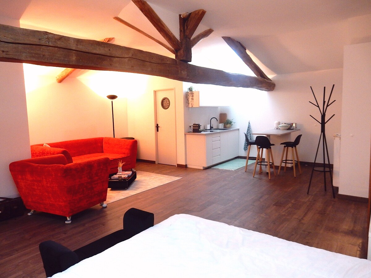 2, 3 veya 4 kişilik konforlu klimalı stüdyo. - Mutfak (ısıtıcı, buzdolabı, mikrodalga fırın, kahve makinesi, su ısıtıcısı, 4 kişilik masa + 3 kişilik bar masası), tabak çanak ile birlikte. - 4 kişilik yatak (160 cm'lik 1 yatak + 140 cm'lik 1 çekyat). - Duş ve tuvalet bulunan banyo. Karakteristik bir evin ikinci katında bulunmaktadır (binanın arkasındaki bağımsız bir kapıdan özel erişim). Rezerve edilmiş park yeri ile sakin bir ortam.