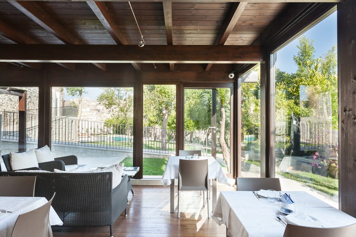 Üzüm bağlarıyla çevrilidir. Tipik antika mobilyalar. Panoramik odalar. Harika organik kahvaltı. Arap bahçesinde yüzme havuzu. Denize 13 km.