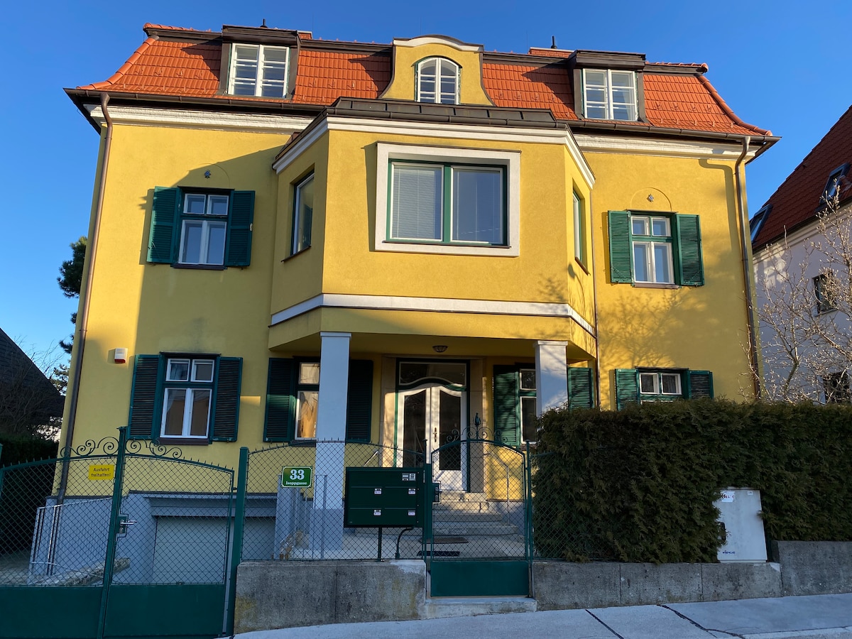 Das Apartment Bellevue (100 m²) befindet sich im ersten Stock unserer eleganten Jugendstil-Villa, die 1913 erbaut wurde. Die Villa liegt in einer idyllischen Grünlage am Fuße des Maurer Berges, abseits der Straße auf einer Anhöhe. Das Apartment ist nach Süden und Osten ausgerichtet und bietet einen wunderschönen Balkon mit Blick auf die beeindruckenden, jahrhundertealten Bäume des rund 5000 m² großen Parks sowie auf den malerischen Wienerwald.