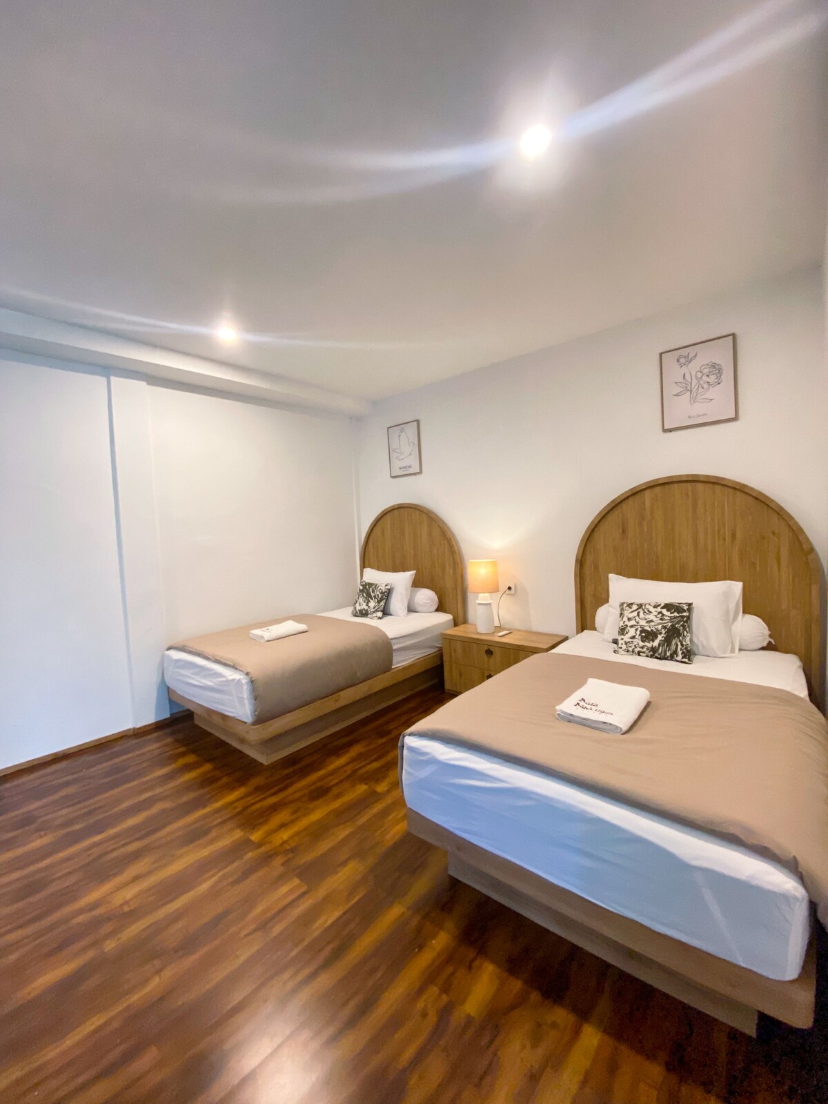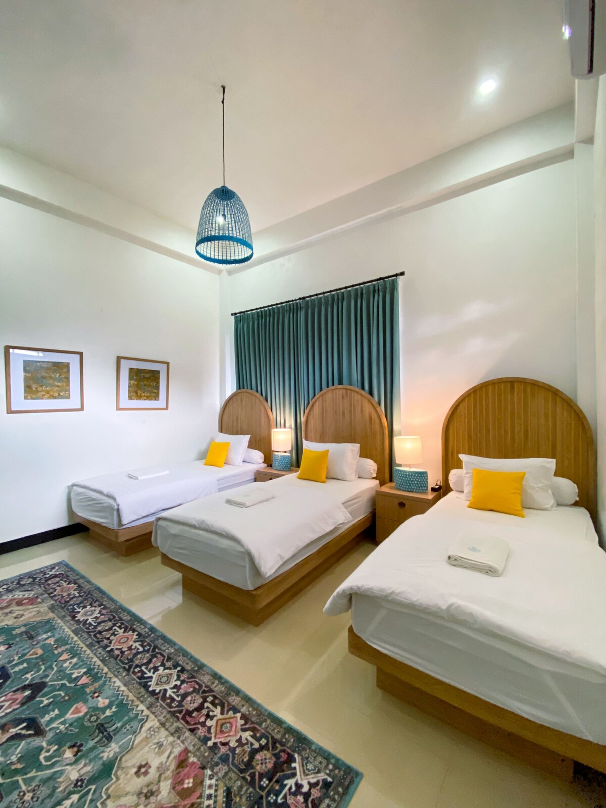 designed with a blend of modern comfort and artistic elegance. The room features a comfortable double bed with premium linens, air conditioning, and a calming color palette highlighted by unique patterned tiles and handcrafted furniture. Natural light fills the room through large windows, creating a bright and welcoming atmosphere. Guests will enjoy thoughtful details such as ample storage space, a work-friendly table, and warm ambient lighting—perfect for both relaxing and productive stays.