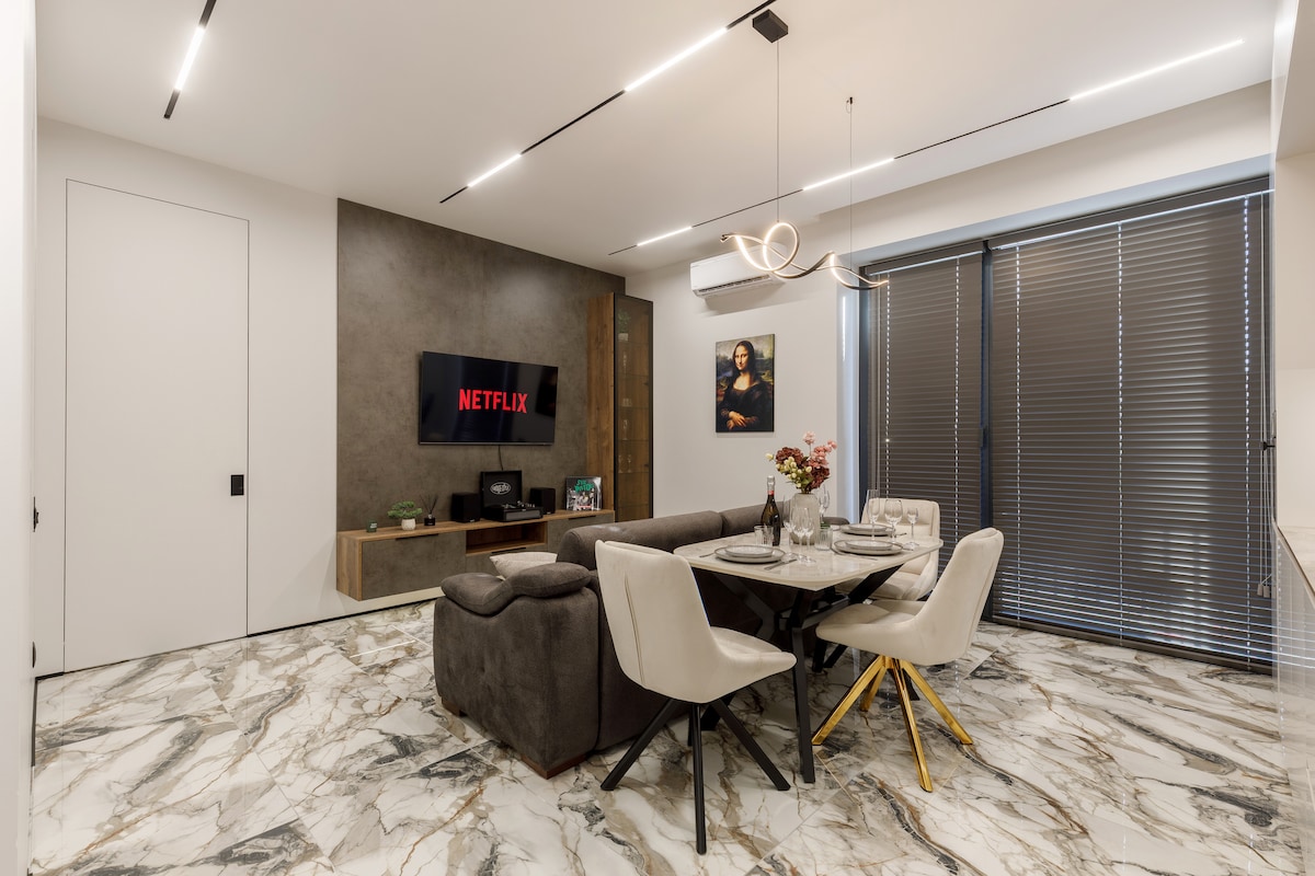 Relaxează-te într-un apartament elegant în inima Chișinăului, cu finisaje din marmură și lemn natural. Te vei bucura de o saltea premium Vi-Spring Bedstead, o cadă spațioasă și un balcon cu șemineu decorativ. Apartamentul are perdele cu telecomandă și espressor cu cafea pe boabe Blocul beneficiază de recepție și pază 24/24, oferindu-ți un plus de siguranță, confort și liniște pe durata întregii șederi.