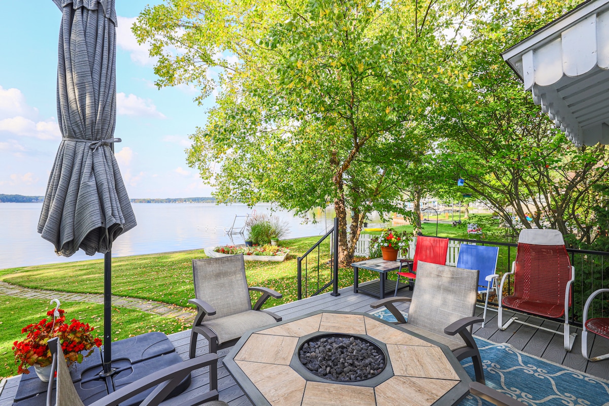 All Seasons Lakefront Cottage Getaway - Uyur 7. Bir tam banyo ve dışarıda duş - Yataklar: 1 Kraliçe, 1 Çift Kişilik, 2 İkiz, Q Çekyat -120 ft'lik özel göl cephesi ve plaj alanında yürüyüş - Büyük bahçe. Masa/sandalyeler ile güverte. Propan Izgara. Şömine. Kanolar ve pedallı tekne - Evcil hayvanlar ve tekneler ev sahibinin onayı gerektirir. Evcil hayvan ücretleri ve kuralları geçerlidir. - Gelişmiş güvenlik ve gönül rahatlığı için ön kapıya bakan kamera.