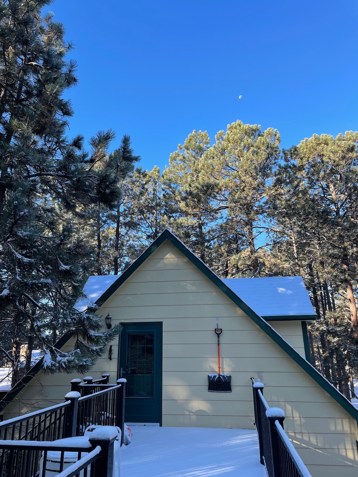 Serene studio apartment, stand alone structure in a beautiful ponderosa pine forest. This quiet apartment has a king sized bed, full bath with bathtub, a kitchenette with Keurig coffee maker, microwave, toaster oven, mini fridge, sink, dishes etc. There is a desk/ dedicated work space and Wifi. A TV, love seat and coffee table. A private neighborhood walking trail one block away that goes to a pond. Free on site parking. Coded door entry. Provided toiletries and snacks. And sunset view.