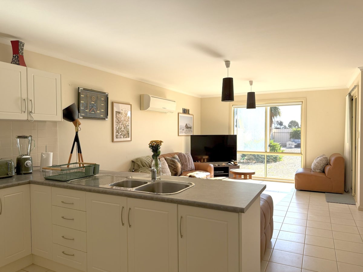Welcome to Sandy's Shores, 400 easy steps to beautiful white sands of sparkling South Beach. You will find a stunning 5km walk, safe swimming, beach-side tree shaded picnic lawn area, BBQ & jetty strolling/fishing, Our "Couples Retreat" welcomes you to cheerful comfort of the entire safe, self contained unit. Our delightful, quiet beachside neighbourhood comes cheerfully to life during holiday times. Unwind, relax, enjoy! You can do nothing or you can do it all on Yorke Peninsula 😃