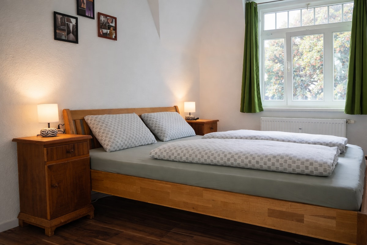 Misafir dairesi evimizin tamamen yeni inşa edilmiş çatı katında bulunmaktadır. Mutfaklı oturma alanı, 2 yatak odası ve büyük bir banyo içerir. En yakın süpermarket 1 km'den daha az bir mesafede ve fırın sadece 2 dakika yürüme mesafesindedir. Gerekirse Cumartesi günleri ekmek servisi mümkündür. Riesa, Leipzig ve Dresden şehirleri arasında, güzel Elbe Nehri'nin hemen ortasında bulunmaktadır. Elbe bisiklet yolu yaklaşık 3 km uzaklıktadır.