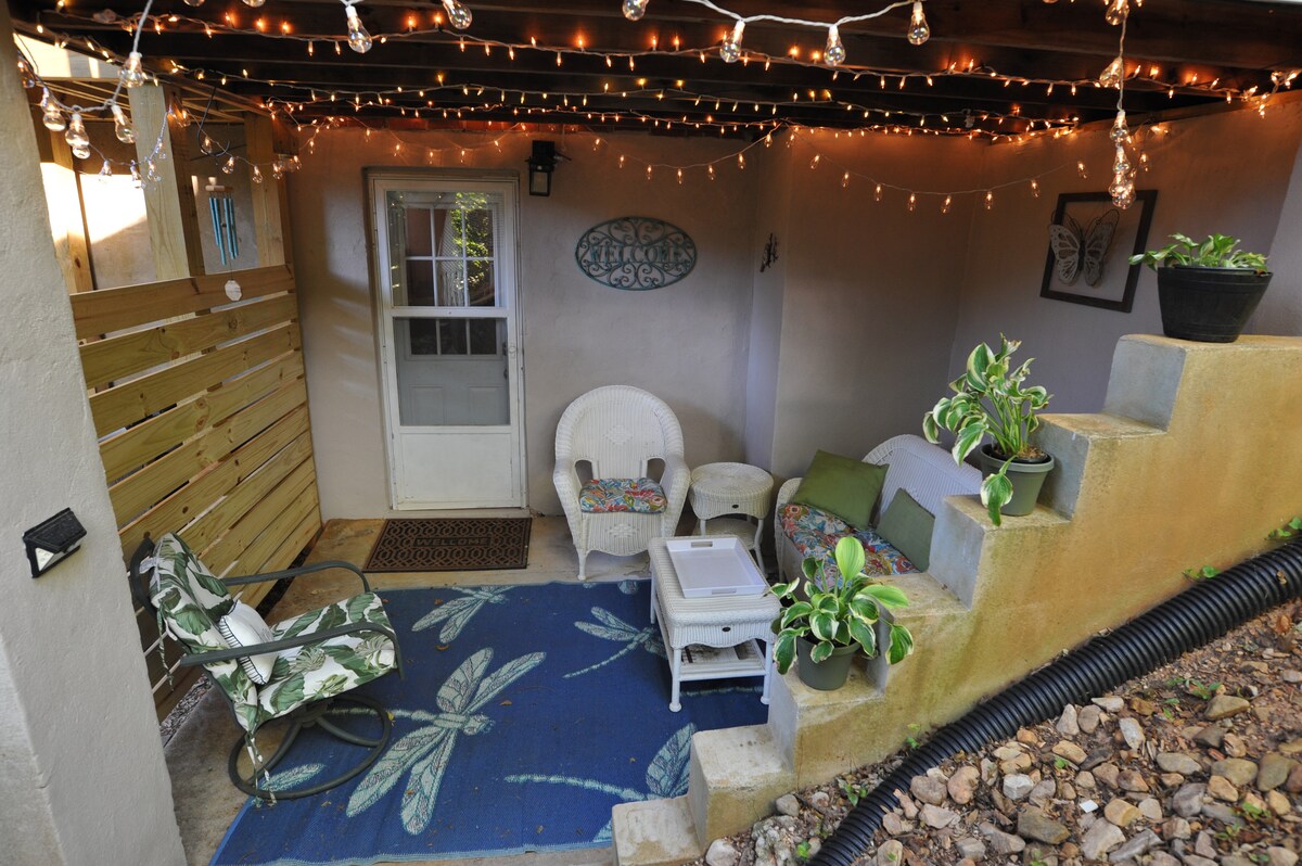 Veranda salıncağı, ağaç salıncağı ve dış mekan aydınlatması ile güzel, ferah, özel arka bahçe. Buzdolabı/dondurucu, Keurig, mikrodalga fırın, ekmek kızartma makinesi, küçük konveksiyonlu fırın (dondurulmuş pizza pişirmek için yeterince büyük) ve küçük bir atıştırmalık/kahvaltı malzemesi içeren küçük mutfak. Ayaklı küvetli muhteşem fayanslı banyo. Rahatlamak için kanepe ve iki kişilik koltuk. Hulu ve Netflix'in yanı sıra masa/kart oyunları da dahildir. Ders çalışmak/çalışmak için masa alanı içerir.