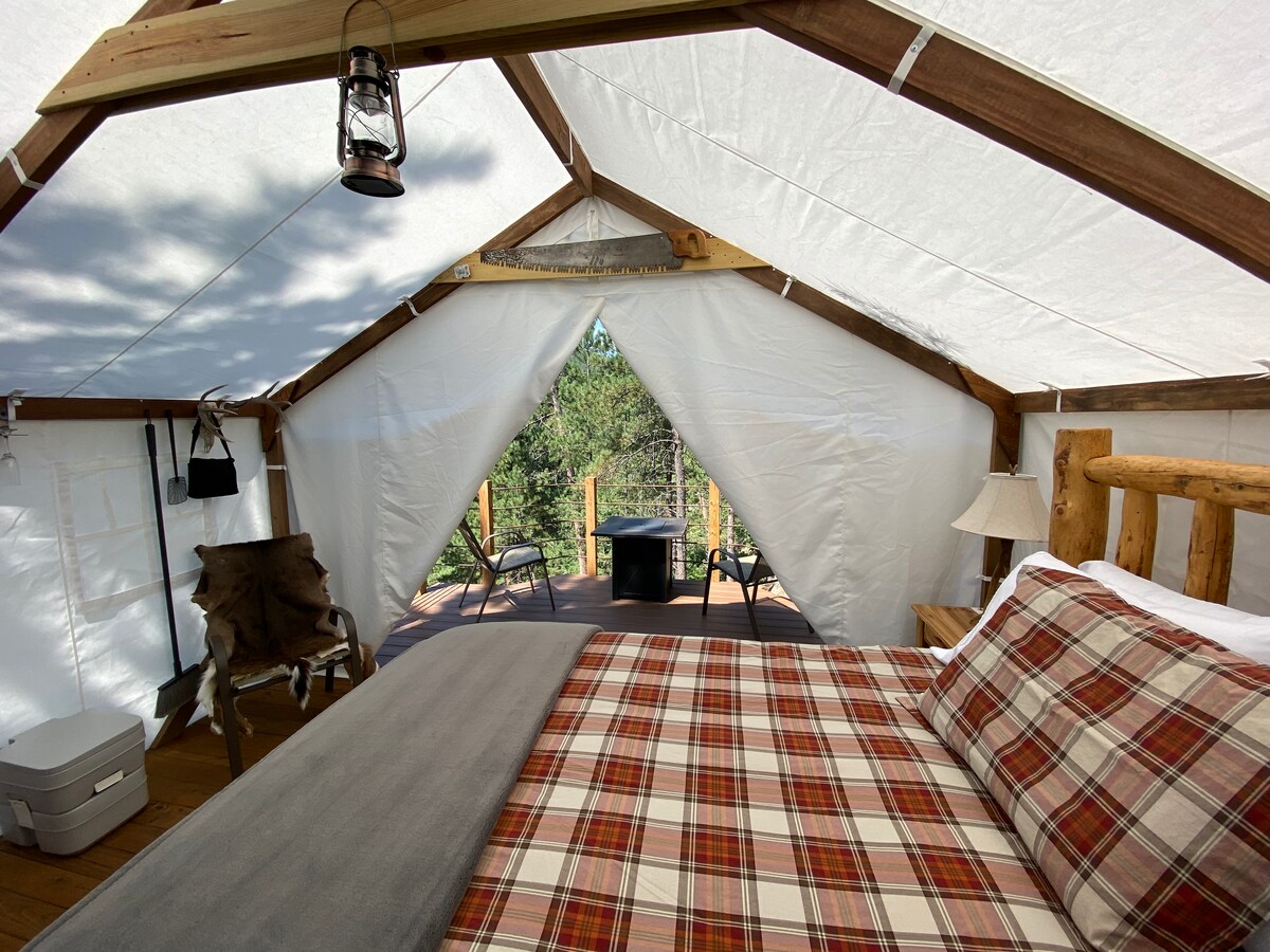 **Diğer iki çadırıma göz atın** www.airbnb.com/h/glamping-in-the-black-hills www.airbnb.com/h/roughrider Hayalinizdeki lüks kamp çadırı, ormanlık dağ sırtının kenarında asılı duruyor. Lüks kamp. Bu 300 metrekarelik güverte, ormanlık tepelerin 20 fit üzerinde yükseliyor. Geniş, neşeli ve tamamen lüks. Black Hills'teki tüm harika cazibe merkezlerine yakın, ancak gözlerden uzak, özel ve romantik bir ortam. Unutulmaz anılar yaratacağınızı garanti ediyoruz!