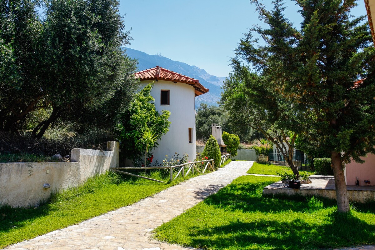 Küçük eski bir yerleşimin ortasında yer alan bu ev, ikiz fos'larıyla birlikte yatıyor. Etkileyici Afales Körfezi'ne bakan ev, dinlendirici bir his ve ince bir zarafete sahiptir. Gün boyunca ferahlatıcı bir esinti akıyor, akşamları yasemin kokusu havayı dolduruyor. Bu en kaliteli ev, modern olanakların tadını çıkarırken doğanın sakinliğini ve köy yaşamının sadeliğini arayan insanlar için idealdir. "Homer's School" arkeolojik alanı yakındadır.