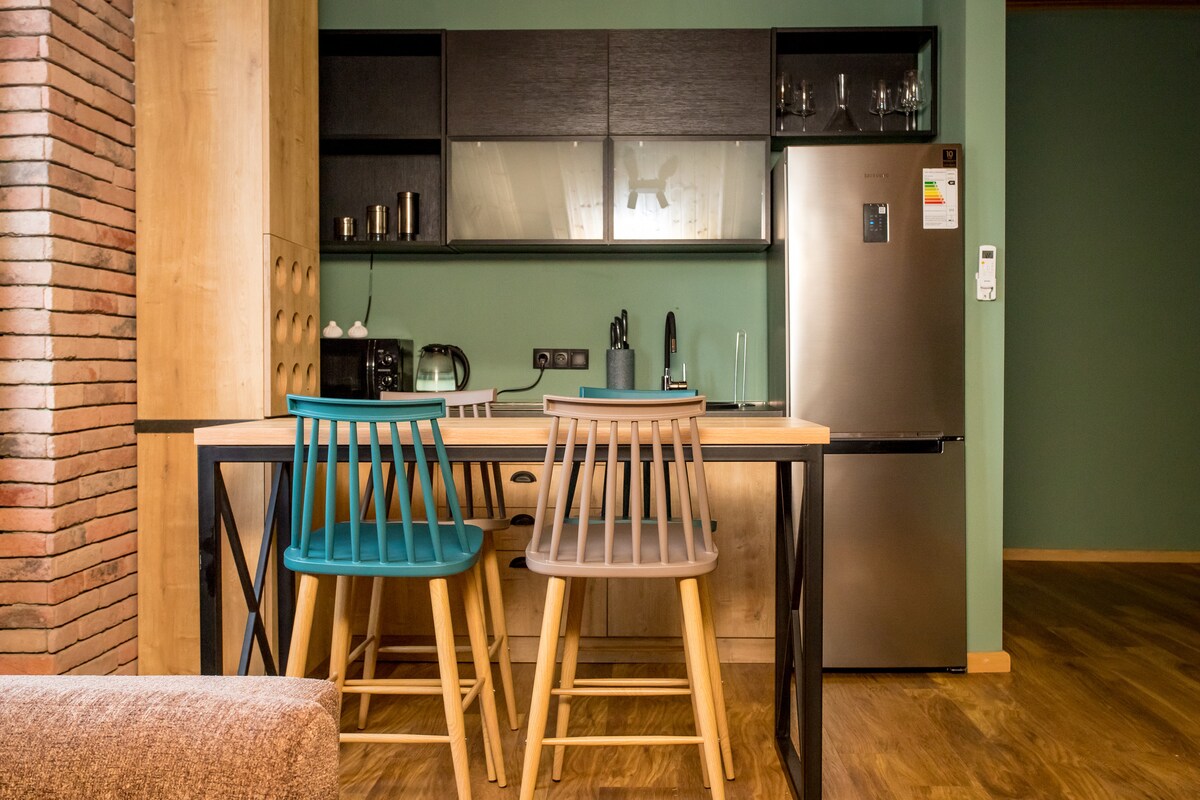 Bu yerin kendine has benzersiz bir tarzı vardır, tarihi binaların nostaljik dış cephesi ve dairelerin modern iç mekanı arasında büyük bir kontrast vardır, misafirler her iki dünyanın da en iyisini yaşayacaktır. Daire, Rustaveli Caddesi'ne 2 dakika uzaklıkta, tarihi Parlamento binasının hemen arkasında, şehir merkezinin göbeğindedir. Tam merkezde olmasına rağmen semt çok sessiz ve huzurludur.