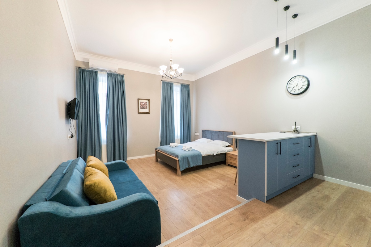 Bu yerin kendine has benzersiz bir tarzı vardır, tarihi binaların nostaljik dış cephesi ve dairelerin modern iç mekanı arasında büyük bir kontrast vardır, misafirler her iki dünyanın da en iyisini yaşayacaktır. Daire, Rustaveli Caddesi'ne 2 dakika uzaklıkta, tarihi Parlamento binasının hemen arkasında, şehir merkezinin göbeğindedir. Tam merkezde olmasına rağmen semt çok sessiz ve huzurludur.
