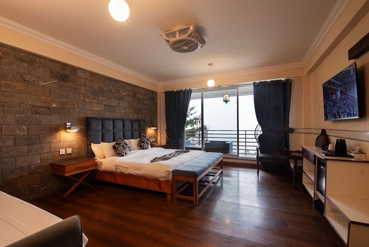 "deluxe room featuring stunning mountain views, a private balcony, modern comforts, and a warm, relaxing atmosphere. Ideal for couples and small families.” The attached modern bathroom includes hot and cold water, fresh towels, and premium toiletries. Daily housekeeping and reliable room service are provided to maintain a clean and comfortable environment throughout your stay. This room is ideal for couples, business travelers, or small families