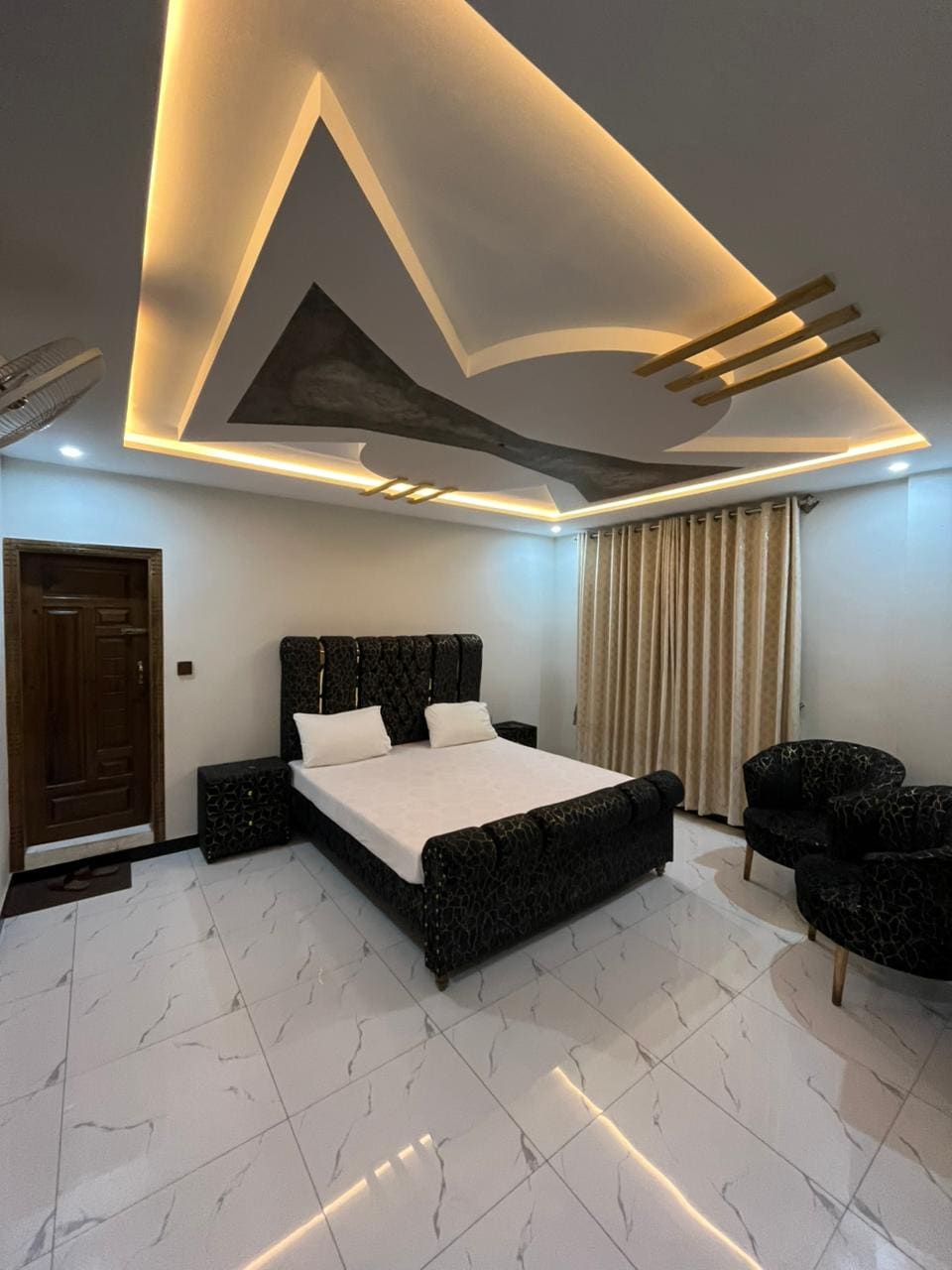 Step into this spacious luxury king suite designed for both comfort and style. The room features a plush king-size bed with elegant upholstered detailing, complemented by a striking designer ceiling with warm ambient LED lighting. Sleek marble-style flooring, rich dark curtains, and coordinated seating create a sophisticated, hotel-style atmosphere. A spacious wardrobe and thoughtful layout make this suite ideal for longer stays or guests seeking elevated comfort and modern elegance.