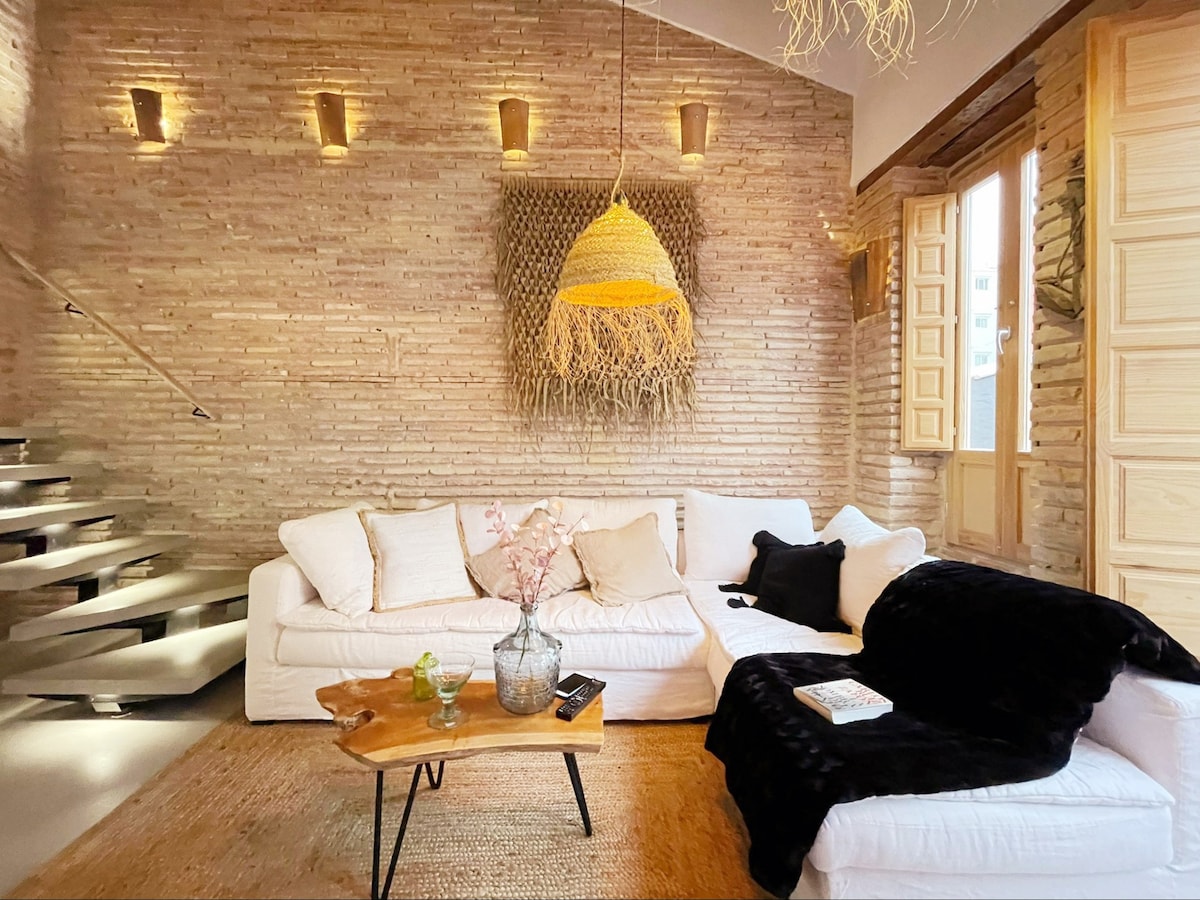 Valencia'nın deniz bölgesi El Cabanyal'ın göbeğinde, Malvarosa Plajı'na 5 dakika mesafede bulunan çatı katı. 1900 yılında inşa edilen ve özünü kaybetmeden tamamen yenilenen ev. Bu çarpıcı daire, geleneksel mimariyi doğal dokulu bir ortamda şık boho tasarımıyla birleştiriyor. Mermer mutfak alanında yemek yerken ve geniş yağmur duşunda serinlerken yüksek tonozlu ahşap kirişli tavanlara ve görünür tuğla duvarlara bakın.