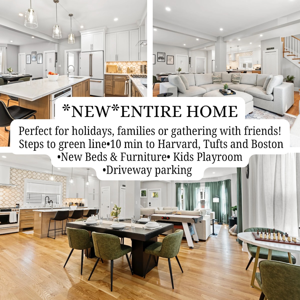 ✨Rated top 1% 🏆in Boston✨ *Historic 1900s Beauty completely renovated* Tucked in a quiet, charming neighborhood only steps (0.3 miles) to the Green Line, 9 minute drive to Harvard, Tufts and downtown Boston. Cozy, modern, and spacious single -family home offers all the comfort and amenities you could need — FREE driveway parking (up to 3 cars)! Kids playroom, plenty of space to relax and enjoy friends and/or family with open floor plan, large dining table,games, air hockey, and ping pong!