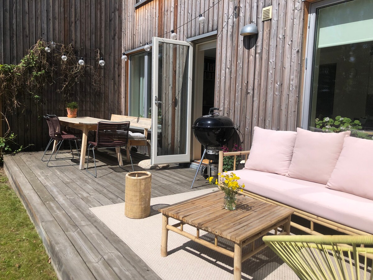 Alt kat: Açık planlı mutfak/yemek odası/oturma odası. Çift kişilik yataklı misafir odası, çamaşır odası, duş odası. Üst kat: Balkonlu ana yatak odası, 140 cm yataklı iki tek kişilik yatak odası, küvetli ve duşlu büyük aile banyosu, gömme dolap ve TV odası. Barbekü alanı ile dışarıda büyük bir teras. Harika komşuları olan sessiz bir semt. Otobüs, tren veya bisikletle Stockholm merkezine 30 dakika mesafede! Tren ve otobüs durağına 5 dakika mesafede. Yürüyüş, yüzme, kano vb. için göle, denize veya ormana 5 dakika.