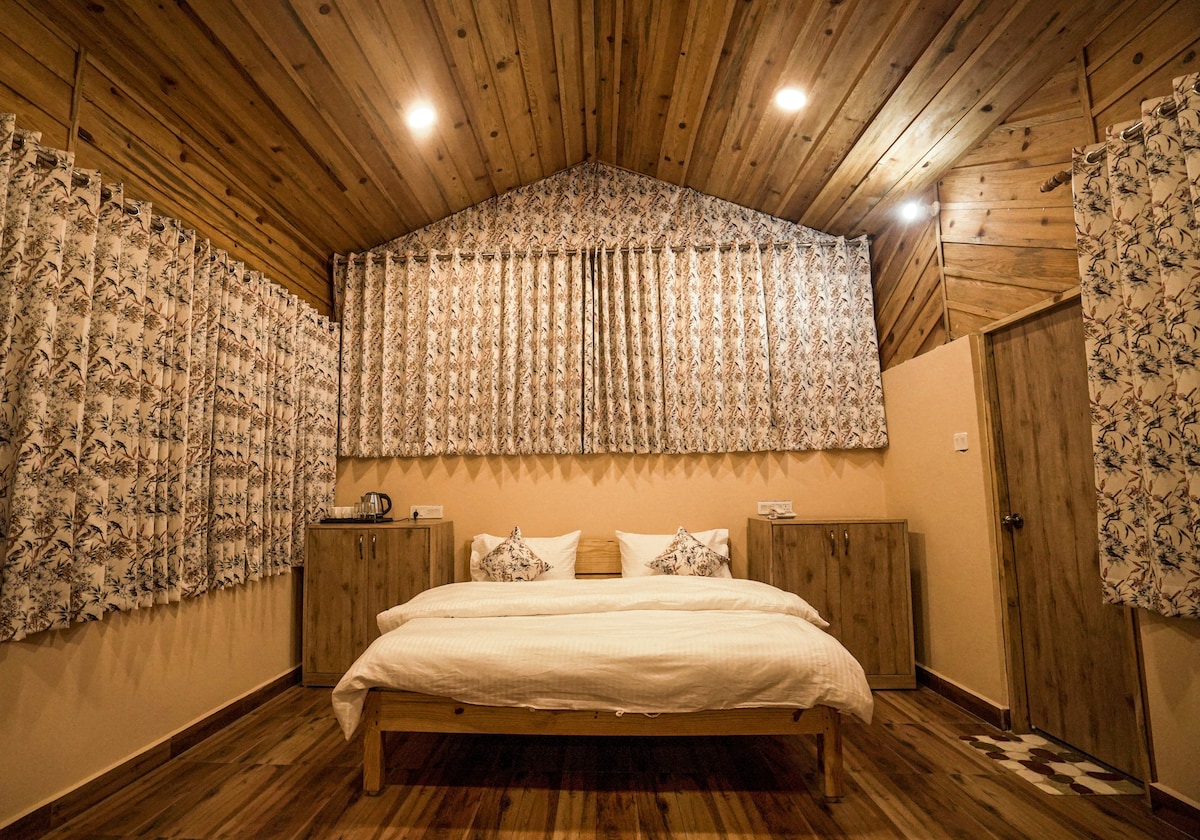 Perched on a peaceful hillside near Bhimtal within an estate, this hillside stay combines natural charm with modern comfort. With scenic views, it features a king-sized bed, wooden interiors, and a 32” TV; it’s designed for relaxation. Guests can savour sunset & sunrise vistas, unwind on the lawn with a BBQ & bonfire, or enjoy meals at the in-house dining. Close to Chota Kailash Dwar, trekking trails, Naukuchiatal (11.4 km) and the paragliding site (8.3 km), perfect for calm and adventure.