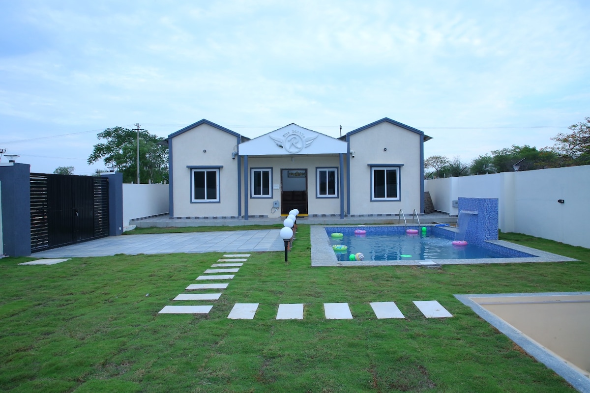 peaceful night stay with Joyful pool, Hall with attached kitchen and Bedrooms with attached washrooms and open garden with a stage .