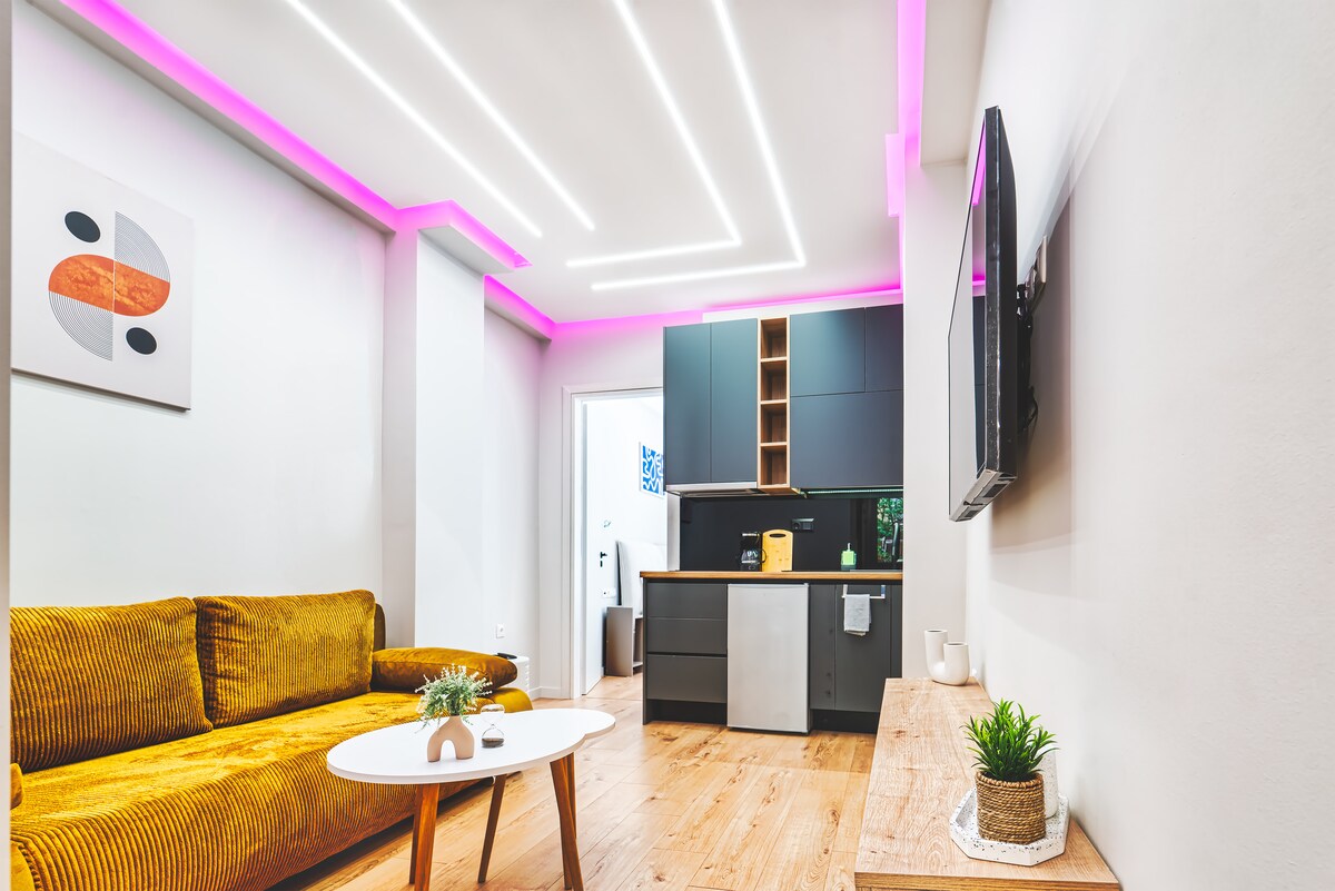 A newly renovated apartment conveniently located in the heart of Athens. Inspired by a love for Mid Century Design, every detail in this home has been carefully selected to provide a retro look with all the modern conveniences. Only a 3 minute walk to the nearest metro station and 4 stops away from Monastiraki Sq, you'll have easy access to all the must-see attractions of Athens.