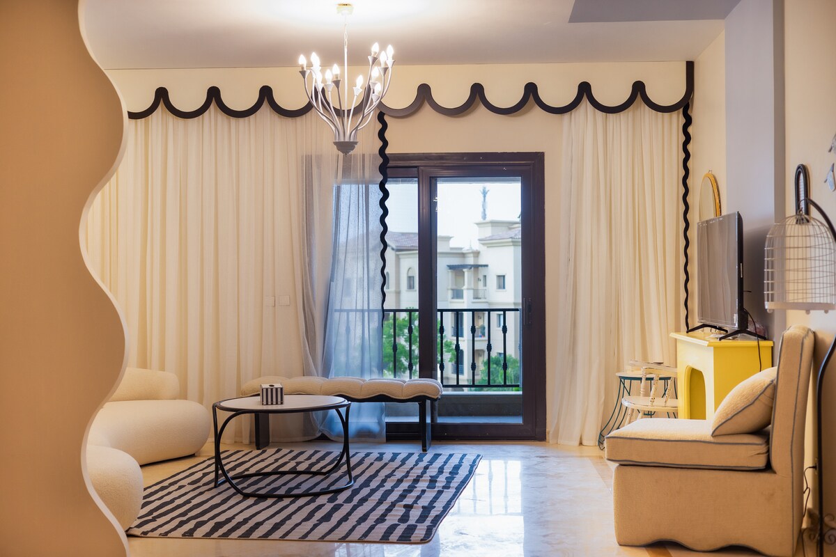 Yeni Kahire'deki Stone Residence'da şık 3 yatak odalı zemin kat dairesinde konaklayın. Ebeveyn banyosu, iki modern banyosu ve özel bahçesi ile aileler veya iş için seyahat edenler için mükemmeldir. Misafirler kendi kendine giriş, yüksek hızlı kablosuz internet bağlantısı ve yerleşke içindeki birden fazla havuza, göle, spor sahasına, kafeye ve çocuk alanına erişimden yararlanır.