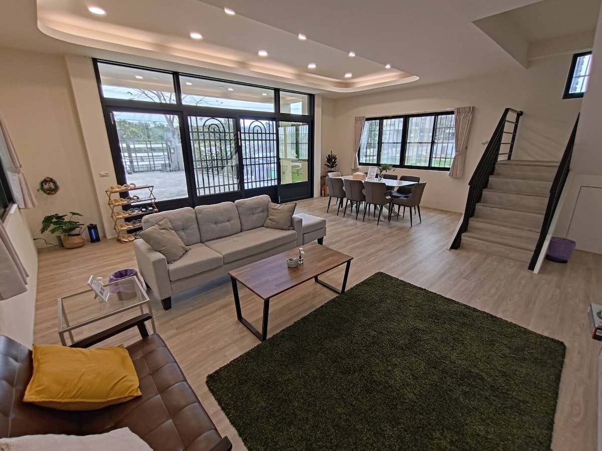 優質的房源與戶外空間,整體空間寬敞,內附有KTV、麻將桌、室內遊戲,後院100多坪草皮區附有露營天幕、露營桌、露營椅 以及其他戶外遊戲,給予跟野外露營一樣的休閒趣味,讓您有舒適的住宿環境之外,又能體驗戶外露營的雙重享受。 前有寬敞庭院可停6台車,後面亦有大空地能停4台車與100多坪人工草皮能辦各類活動。 -------------------------------------------------------------------------------------------- 住宿房間 4人套房 *1間 雙人套房 *1間 雙人雅房 *2間 公共浴廁 *2間 加床每人350元 ( 最多加至2床 ) 內部空間 : 附有KTV、麻將桌、其他兒童與成人室內遊戲。 外部空間 : 附有露營天幕、露營桌2張、露營椅8張、其他戶外遊戲。 適合家族或好友們一同入住,以及有各類活動場地需求的朋友們。 ***補充*** 1.無早餐供應 2.無提供牙刷與牙膏 附近1分鐘路程有全聯以及7-11可以提供生活所需,謝謝您。
