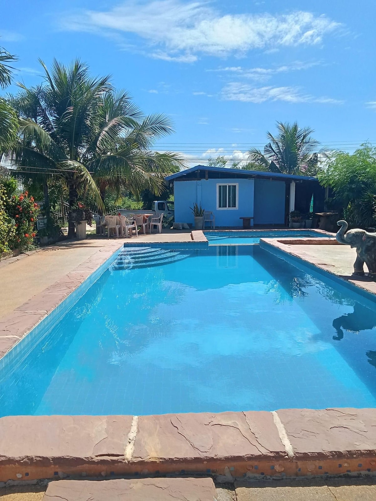 Yüzme havuzu, şofben, pazara yakın tam donanımlı mutfak ve ücretsiz otopark ile sessiz ve benzersiz bir konaklama yerinde dinlenin. Sizi alacak bir araba var, kiralayabileceğiniz bir motosiklet var.