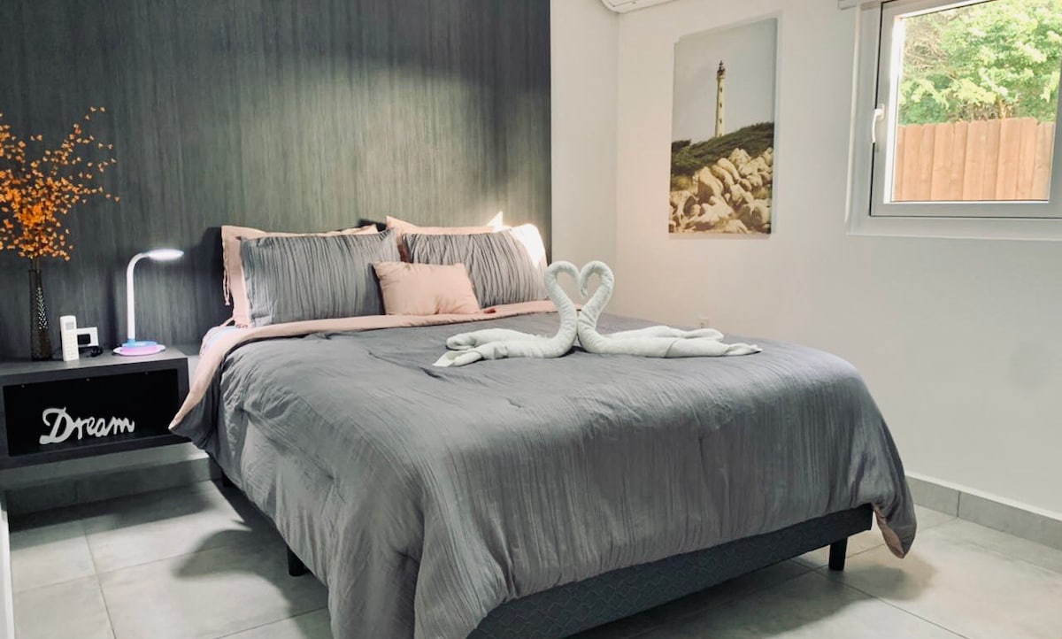 Yüksek tavanlı ve özel girişli ferah dairemizde konforun tadını çıkarın. Plaj sandalyeleri, palmiye ağaçları ve rahat bir verandası olan yemyeşil bahçede dinlenin. İçeride hem oturma odası hem de yatak odası klimalıdır. Temiz havlu ve duş jeli de dahil olmak üzere tüm temel malzemelerle donatılmış konaklamanız sorunsuz olacaktır. Eagle Beach'e sadece 15 dakika yürüme mesafesinde ve yerel mağazalara 7 dakika mesafededir. Her türlü sorunuzda yardıma hazırız.