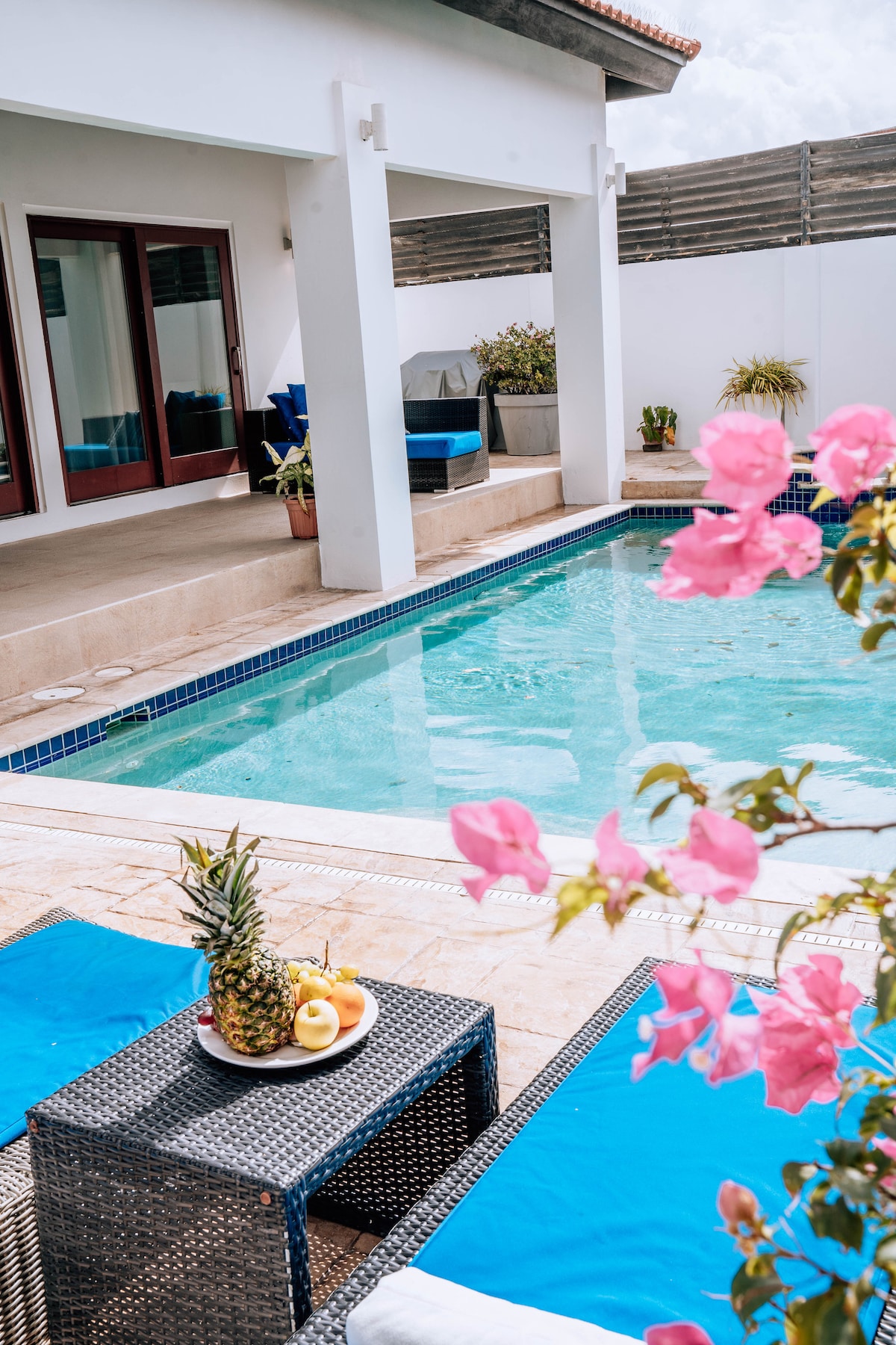 Cute townhouse perfect for a relaxing time, overlooking Hooiberg. Enjoy a beautiful tropical garden with a backyard and pool, ideal for a nice breakfast or coffee. Listen to birdsongs and feel the tropical breeze in the front garden, backyard, or by the pool. Conveniently located a 5-minute car ride from the airport, with the bus stop just a 10 to 15-minute walk away. Surfside Beach and local bars are within a 20 to 30-minute walk, and Oranjestad is a 15-minute drive