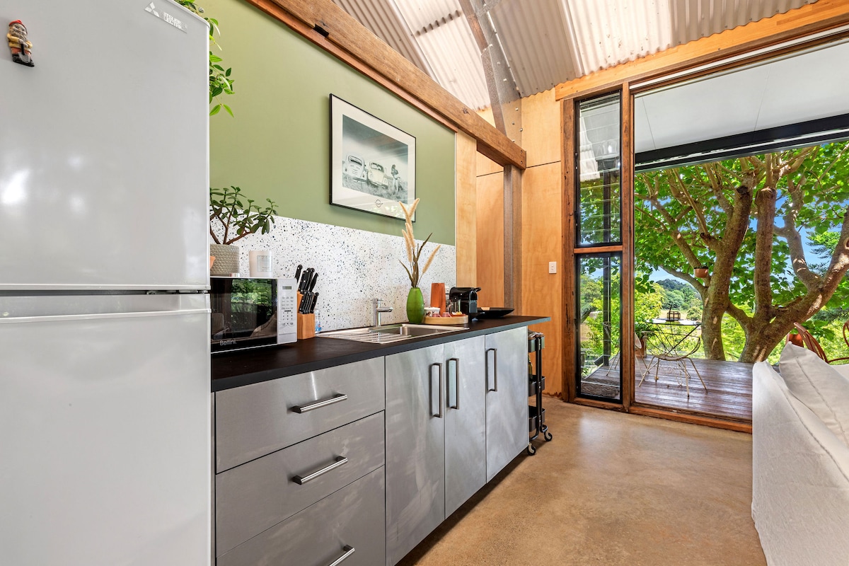Featured in Country style magazine and Urban List as unique places to stay in SE Qld Beautiful views overlooking farmland and distant mountain ranges. Clad in striking Monument steel eclectic styling but with all the modern conveniences Rustic polished concrete floors , ply walls , unique arched salvaged timber windows and impressive 3.4 m bifold doors opening to a wide 4m deck overlooking a crackling warm iron clad fire pit plus full access to 18metre lap pool and grass Tennis court