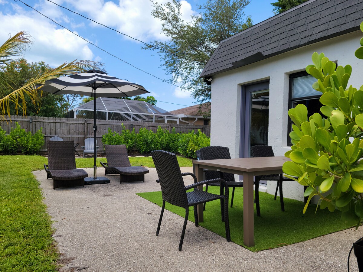 This serene, private-entry upscale studio is fully furnished, has a screened patio, and looks out onto a fenced back yard that includes a patio and chickee hut. Located in Naples Park a mile from the gulf, close to two public beaches, and down the street from the upscale Mercato mixed use complex that contains markets, restaurants, night clubs and other amenities. Newly renovated, with zero-entry shower, heated towel rack, bidet, high-speed Wi-Fi, TV, and full kitchen.