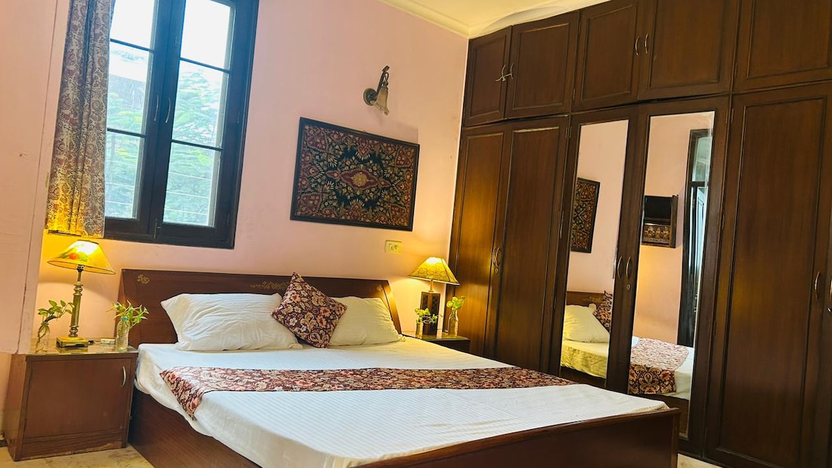- 1 Bedroom apartment with attached with fully equipped kitchenette and bathroom is located at the ground floor of a residential building. - All the necessary amenities for a seamless experience. - Fresh towels and toiletries. - Wifi with 55' inch TV (including Netflix, Amazon prime & Hotstar etc). - couple friendly. - 6 km from IGI Airport, New Delhi. - 1.3 km from Indian Aviation Academy. - 1.4 km Indian Spinal Injury Center. - 3 km DLF Emporio Mall, Vasant Kunj. - 4 Km from Fortis Hospital