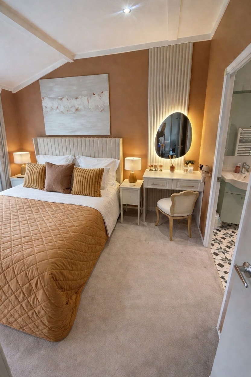 Bu birinci sınıf Pemberton Rivendale Lodge'da biraz lüksün tadını çıkarın. Bu büyük 20 ft x 40 ft pansiyon (iki karavan büyüklüğünde) göl kenarındadır ve parkın en büyüğü olan güneye bakan devasa bir döşemeye sahiptir. Rattan bahçe mobilyalarıyla tamamlanmıştır, bu da gün boyu güneşin tadını rahatça çıkarabileceğiniz anlamına gelir. Bu pansiyon, Amerikan tarzı buzdolabı, tam boy bulaşık makinesi ve çamaşır kurutma makinesi dahil olmak üzere tam donanımlı bir mutfakla tamamlanan yüksek özellikli bir iç mekâna sahiptir.