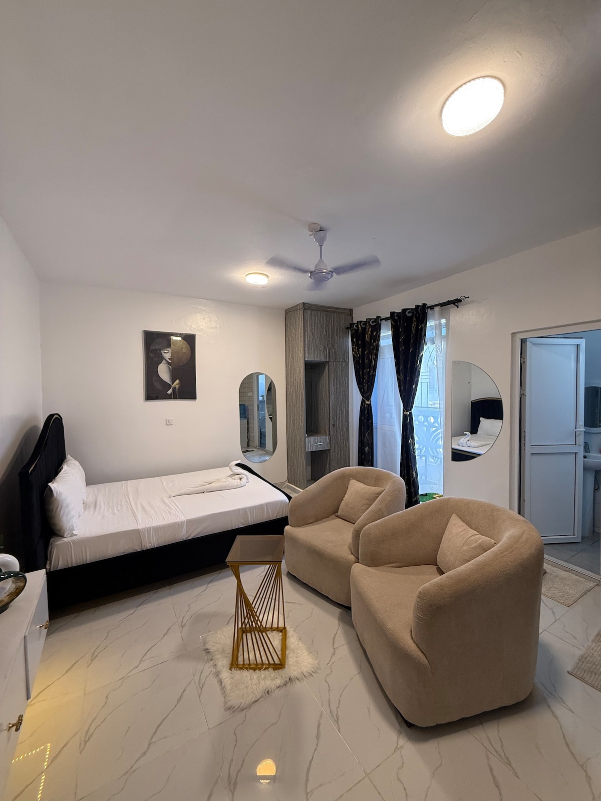 Sahildeki sığınağınıza hoş geldiniz! Bu özenle tasarlanmış stüdyo, Mombasa'nın kumlu kıyılarının güzelliğini ve Svahili mirasının zarafetini yansıtıyor. Okyanustan esinlenen yumuşak renklerden el yapımı ayrıntılara kadar her köşe konaklamanızı dinlendirici, konforlu ve unutulmaz hale getirmek için tasarlanmıştır. Okyanus hissiyle uyanacaksınız! İster güneşin tadını çıkarmak ister tarihi keşfetmek ister romantik bir kaçışın tadını çıkarmak isteyin, bu stüdyo Mombasa maceranız için mükemmel bir merkezdir!