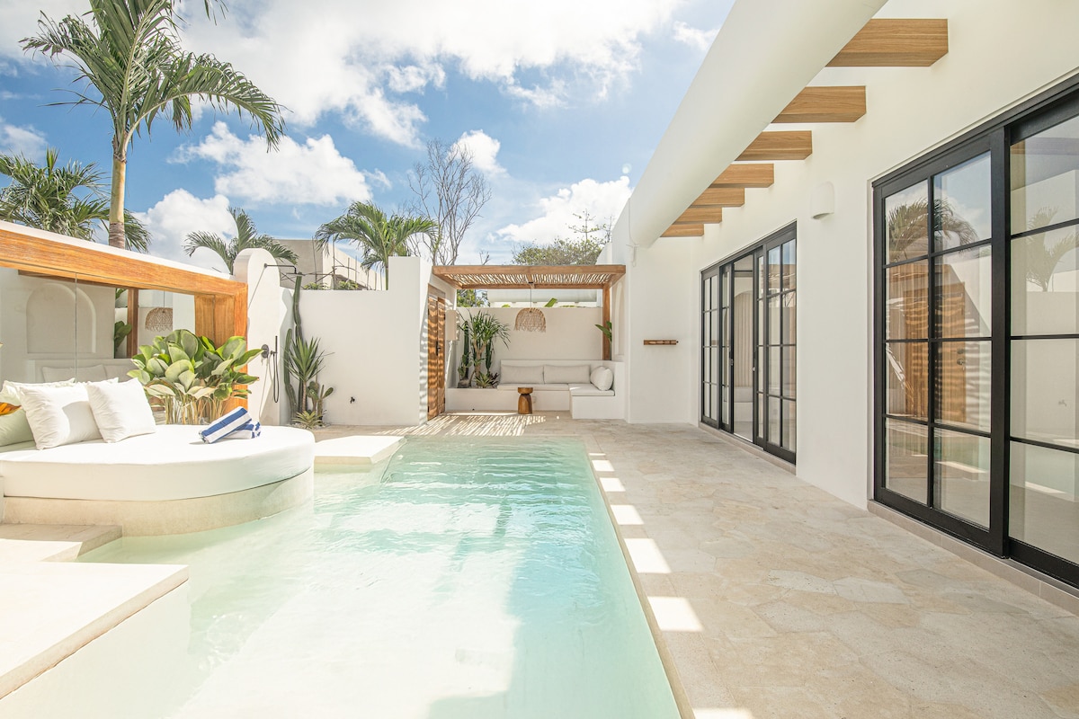 Step into a luxurious boho retreat, just 2 minutes from the beach, where a serene 2-bedroom villa awaits. Each suite boasts an elegant ensuite, private plunge pool, AC, WiFi, a chef’s kitchen, and a refined open-plan living area. Flooded with natural light and adorned in artisanal decor, the villa invites sunrise reflections, moonlit dips, inspired lounging, and gourmet moments in style.