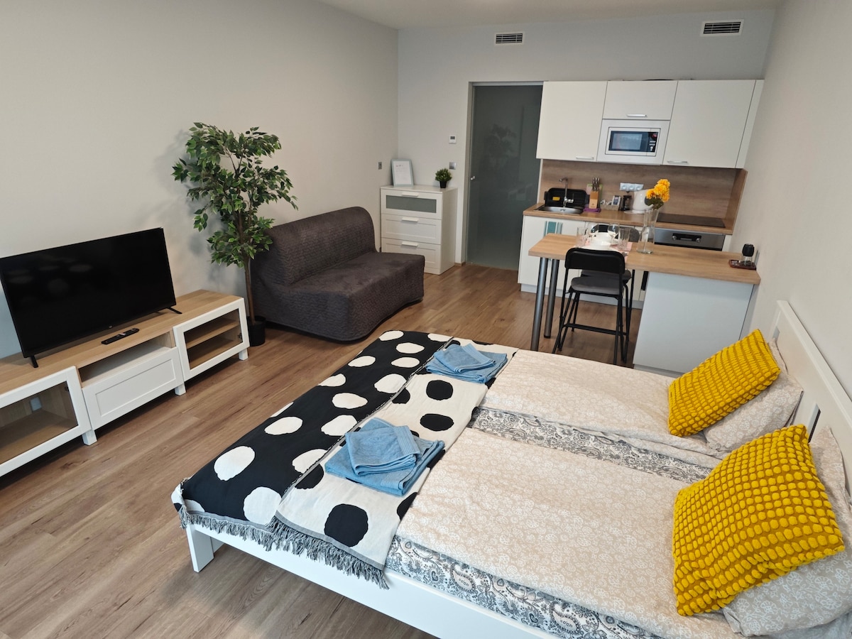 Nový,pohodlný a moderní apartmán v přízemí činžovního domu s vlastním vstupem z ulice.V ceně pobytu máte kávu, čaj, vodu.Vybavený minibar za poplatek. Samozřejmostí je 100% čistota,k dispozici ručníky,osušky,hygienické potřeby,fén, žehlička,vařič. V pěší vzdálenosti zastávka MHD 5 m, metro 300 m, O2 aréna 1500 m.OC Fénix, posilovna,bazén 400 m. Do centra 20 min. MHD.Staňte se našimi hosty a náš apartmán se stane Vaším domovem na 1 i více nocí.Rádi vyjdeme vstříc Vašim přáním. Těšíme se na Vás !