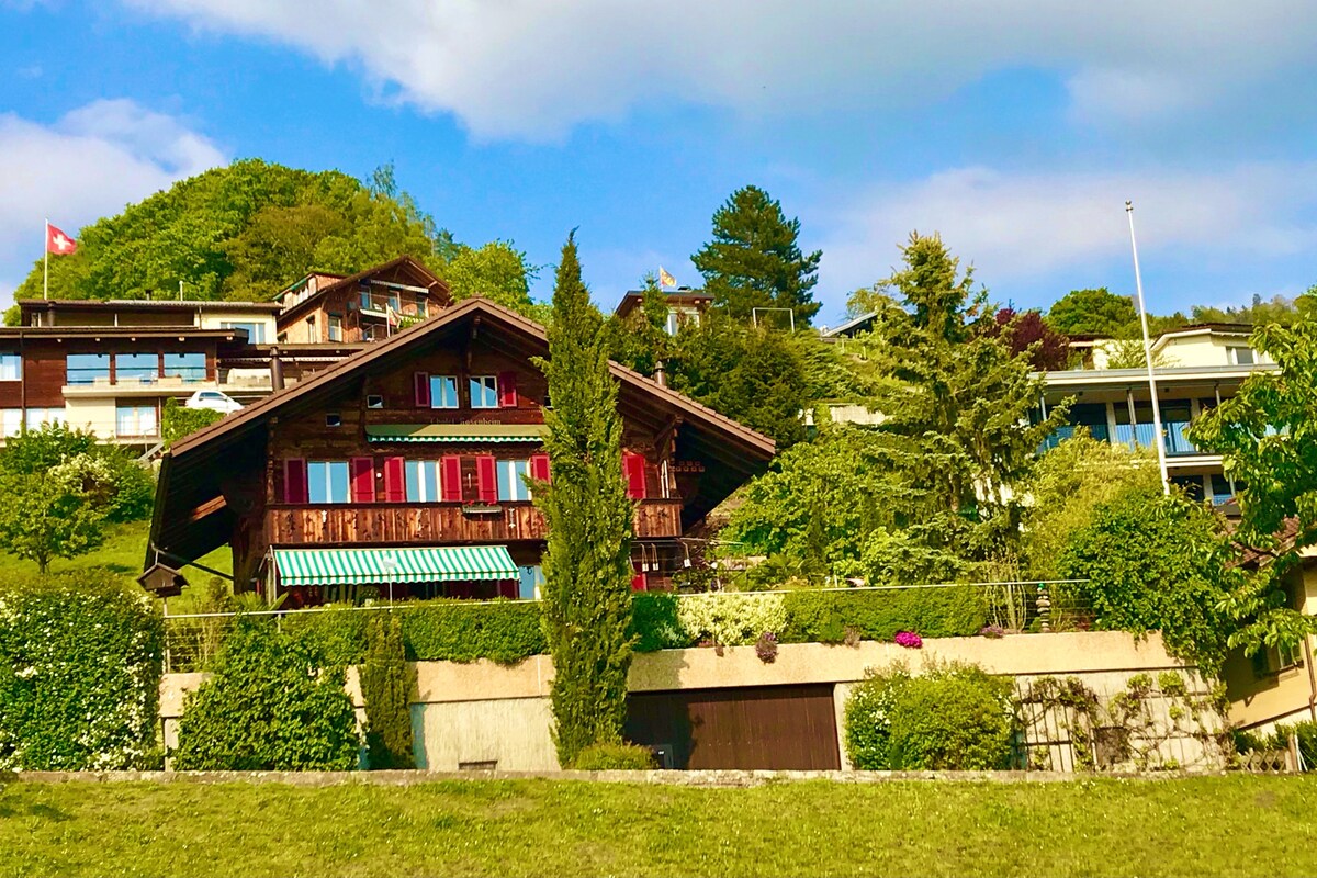 Büyük büyükbabam tarafından 1927'de inşa edilen büyüleyici bir İsviçre dağ evinde konaklayın. Thun Gölü'nün, dağların ve Oberhofen Kalesi'nin muhteşem manzarasının keyfini çıkarın. Dairenin 2 yatak odası, tam donanımlı mutfağı, konforlu bir oturma alanı ve büyük bir balkonu bulunmaktadır. Thun, Interlaken ve kayak ve yürüyüş alanlarına yakın, yakınlarda mağazalar, restoranlar, yüzme ve sağlıklı yaşam alanları bulunmaktadır. Tüm yıl boyunca dinlenmek veya macera yaşamak için mükemmel! Bölgede çeşitli indirimler ve ücretsiz toplu taşıma sunan Panorama Kartı alırsınız.
