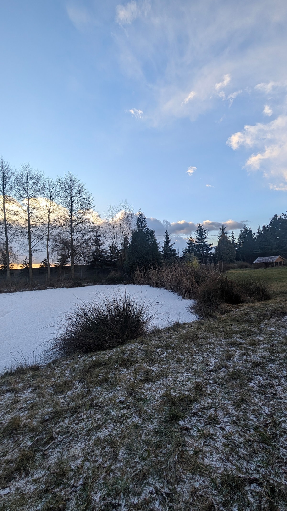 Mini-Lake-Bude im Winter – Teich gefroren, Lagerfeuer an, Zelt ausgepackt, alles cozy. Grill geht klar, Glühwein oder Frühstück bei Bedarf. Kleines Wohnzimmer, Bett und Sofa für zwei – easy. Küche ready, Kaffeeautomat für Frühaufsteher.