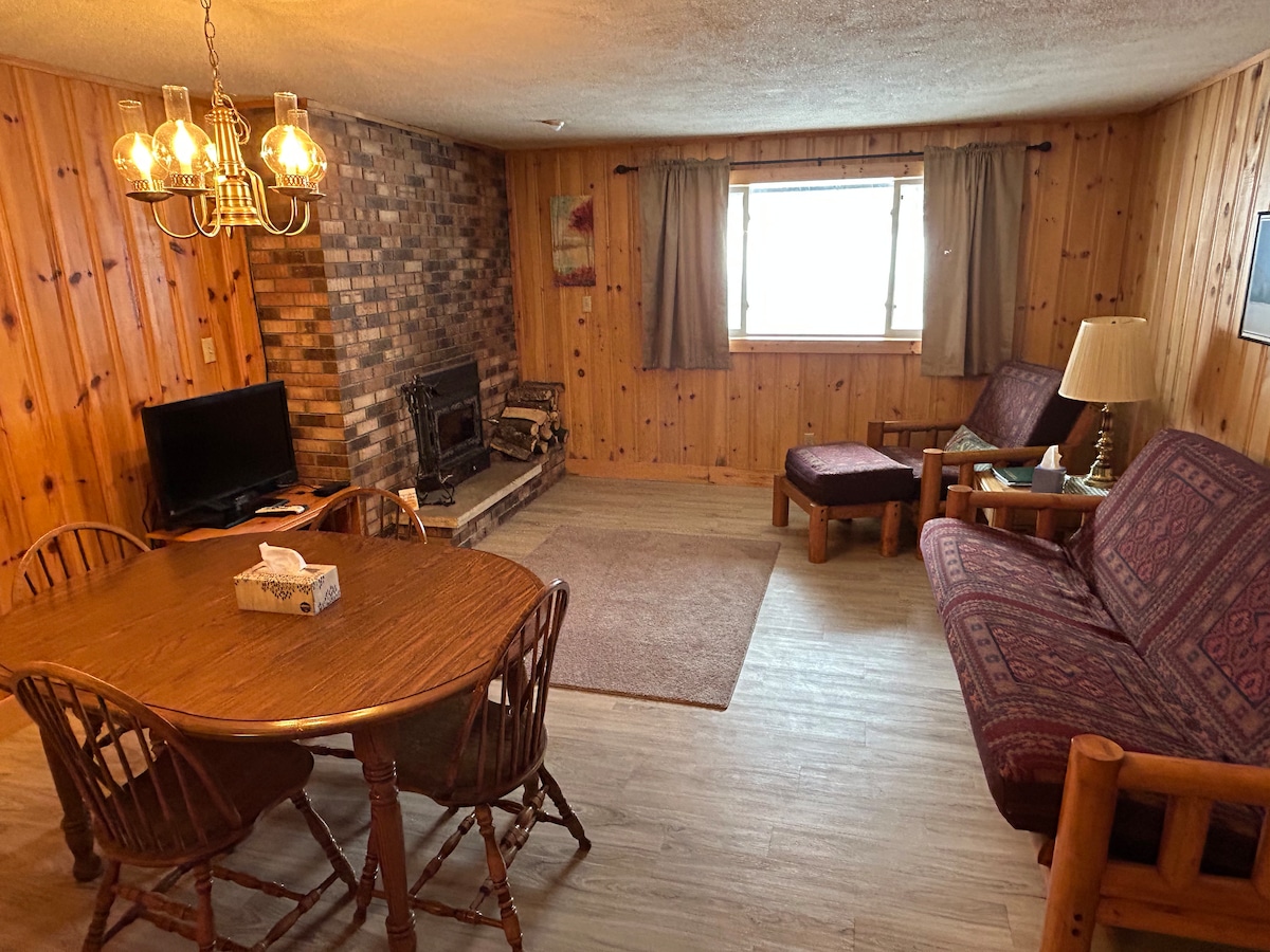 Yatak odasında bir queen yatak ve oturma alanında çekyat bulunan tam bir konut. 4 kişi rahatça uyuyabilir. Ayrıca tam donanımlı bir mutfağa da erişiminiz vardır. Kışın mülkten sadece birkaç metre uzaklıktaki Snow River Ski Resort ve kar motosikleti parkurlarının veya yazın kirpi dağlarında yürüyüş ve diğer açık hava etkinliklerinin tadını çıkarın! Şu anda evcil hayvan kabul etmediğimizi bildiririz.