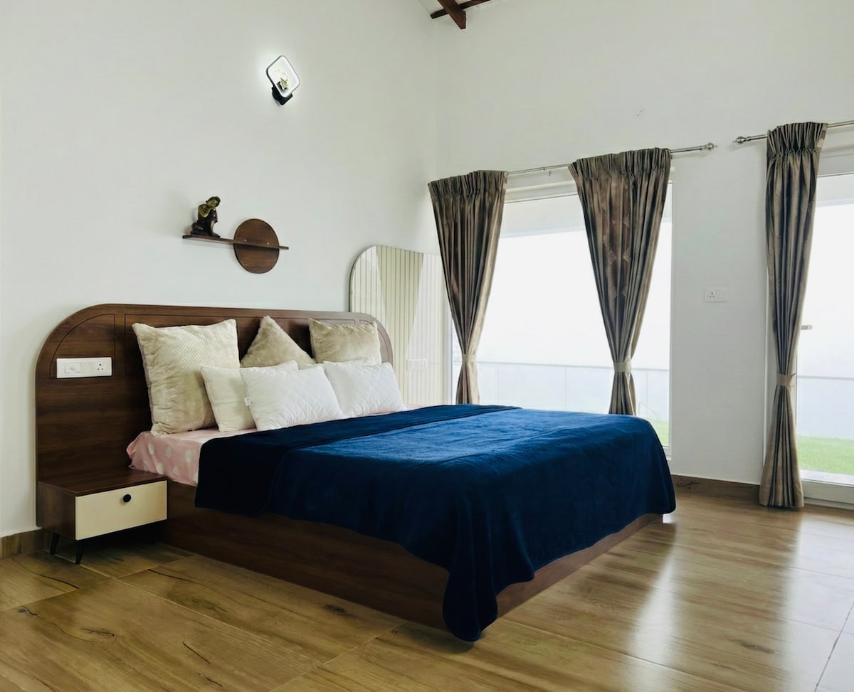 Heaven Dales, a luxurious villa in Ooty’s serene Hill Station. Nestled amid lush hills, this peaceful retreat offers breathtaking views of misty valleys and greenery. The villa features a modern interior with spacious, sunlit rooms, elegant furnishings, and premium comforts. Large windows ensure stunning views from every room. Each bedroom offers a restful escape with plush bedding and en-suite luxury bathrooms. Experience tranquility and elegance at Heaven Dales, where nature meets opulence.