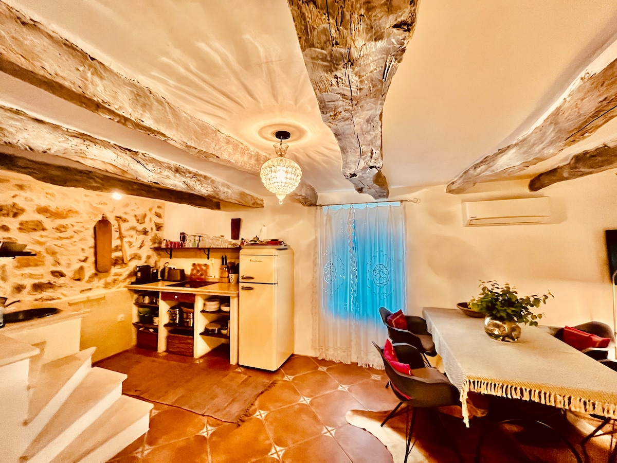 Biraz ülke havası, ruhu ve büyüleyici detayları olan eski, çitle çevrili ve TAMAMEN KLİMALI bir kır evi. Çiçekler ve yeşillikle çevrilidir. Çok seviliyor, el üstünde tutuluyor ve umarım kendinizi evinizde gibi hissedeceksiniz. Olanaklarımıza göz atın. Havuz bölgesi ferahtır ve tüm görünümlerden gizlenmiştir. Bakkaliye dükkanı yakın. Her yıl yeni bir şeye yatırım yapıyoruz, bu yüzden çok donanımlı. Evcil hayvan başına günlük 20 EUR evcil hayvan ücreti varışta nakit olarak ödenecektir.