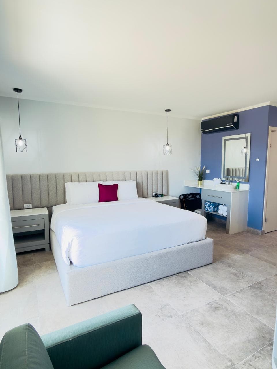 Enjoy breathtaking ocean and sunset views from this modern 4th-floor studio in downtown Oranjestad—just minutes from Eagle and Palm Beach. Relax in style with a rooftop infinity pool, gym, and hot tub overlooking the Caribbean Sea. Queen size bed and modern kitchen. Bar and restaurant on site. Complimentary Keurig coffee maker and Tazo Tea. High-speed WiFi. Washer Dryer, iron & ironing board, hairdryer. 55” Smart TV, Netflix, Alexa device. Private Parking, 24/7 security. Luxury shopping.