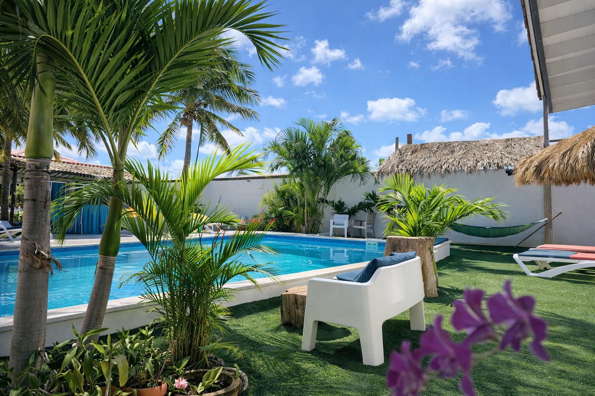 Oranjestad ve plajlara yakın sessiz bir yerleşim bölgesinde daire. 1 yatak odalı daire; - Ilık su bulunan geniş yaşam ve mutfak alanı. - European king, klima, kablolu TV ve dolap alanı bulunan ayrı yatak odası. - Ilık su bulunan lüks banyo. - Havuz ve bahçe manzaralı veranda. - Şezlonglu havuz alanı. - Açık hava duşu - Barbekü - Plaj/havuz havluları, nevresim takımları, havlular vb. temin edilir. - KABLOSUZ İNTERNET BAĞLANTISI DÂHİLDİR - İstek üzerine bavul hazırlama ve mama sandalyesi mevcuttur (en fazla 1 bebek ve 2 yetişkin).