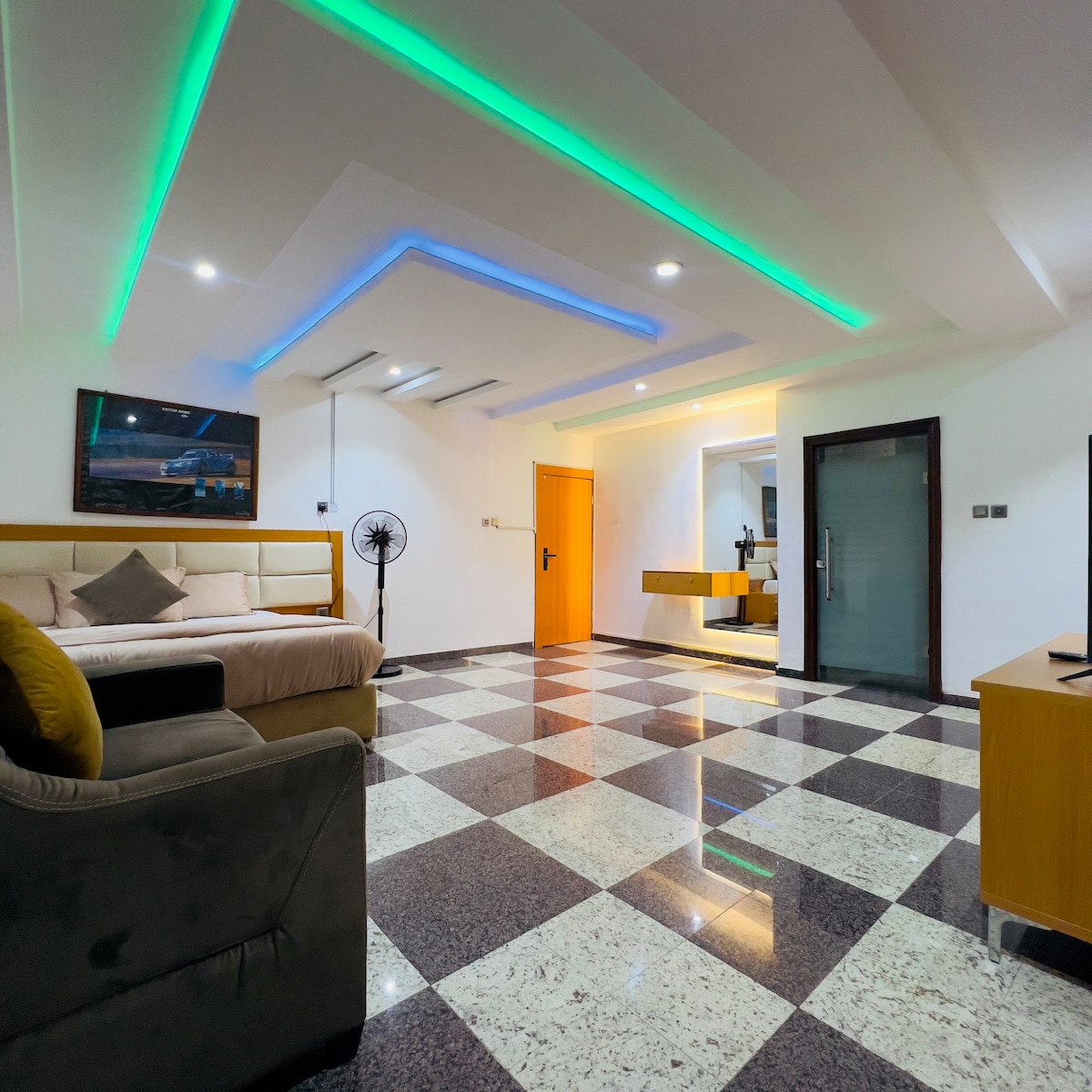 Lagos'un en iyi konumunda, 7 gün 24 saat elektrik garantisi veren yedek güneş invertörü ve jeneratörü ile yeni inşa edilmiş GÜVENLİ bir çatı katı dairesi. Güvenli park yeri olan bu mobilyalı 2 yatak odalı dairede evden uzakta ev deneyimi. Uluslararası Havalimanı'na sadece 5 dakika uzaklıkta ve bankalara, dinlenme salonlarına ve barlara, süpermarketlere, restoranlara vb. yakındır. Bu benzersiz kapalı site daire, hem uzun hem de kısa süreli konaklamalar için idealdir. Huzur ve canlı topluluk yaşamının mükemmel karışımını deneyimleyin.