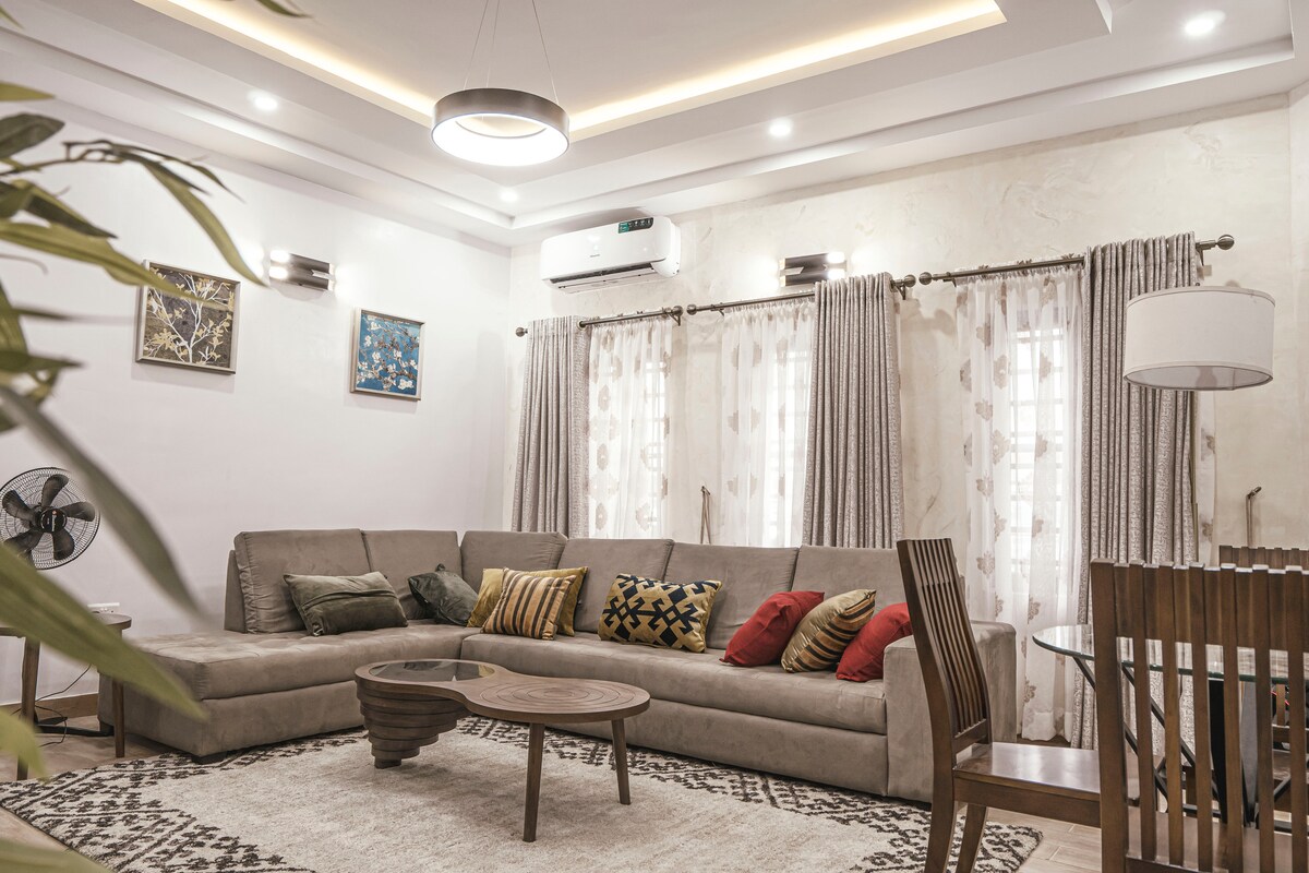 Güneş Enerjili İnvertör, 24 saat elektrik garantili, retro bir Airbnb evi inşa etti. Klimalı oda, vantilatörlü oturma odası, 44 inç LED TV, DSTV, kullanıma hazır mutfak, buzdolabı, tuvalet ve banyo, sıcak su, 33 KVA Jeneratör ve daha fazlası. Klima sadece kamu elektriğinde mevcuttur. Jeneratör ev sahibinin takdirine bağlı olarak çalışıyor.