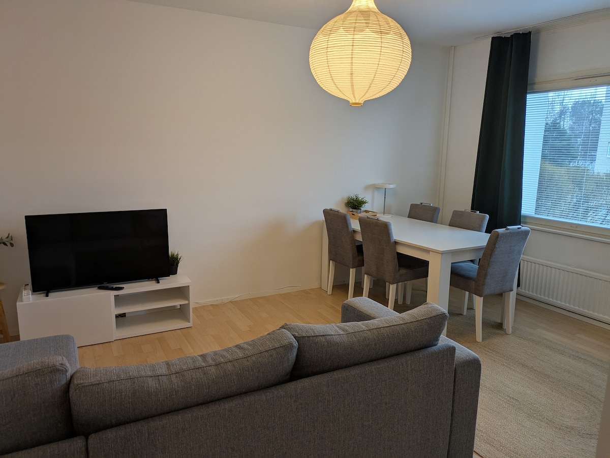 İyi ulaşım bağlantılarına yakın, yeni bir apartmanda sessiz bir konumda iki yatak odalı daire. Temel mutfak aletleri, yatak odasında çift kişilik yatak. Ayrıca, talep üzerine bebek yatağı ve mama sandalyesi ile birlikte ekstra yatak da temin edilebilir Otoyoldan daireye kolayca çıkabilir ve araç için ücretsiz sıcak bir garaj alanı bulunmaktadır. Mağazalar: Lidl 200m (elektrikli araç için şarj, ikinci şarj 300m Neste'nin avlusunda), S-market 3 km (24 saat açık) ve City-market 4 km. Oulu'nun merkezine otobüsle (durağı 200m) veya kendi arabanızla 10 dakikada ulaşabilirsiniz.