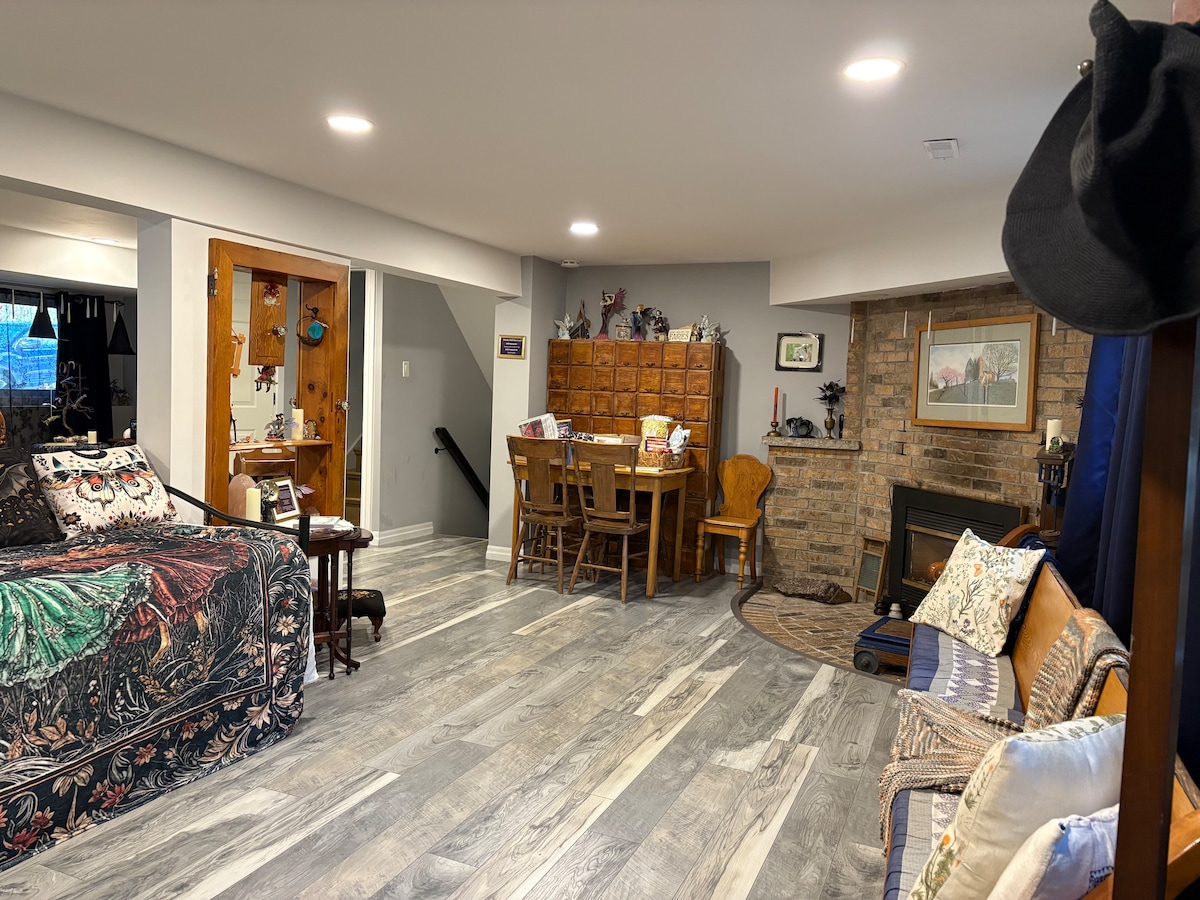Büyü, gizem ve sihir dünyasına adım atın. Sakin bir banliyöde yer alan tuhaf inziva yerimiz tarot ve kahin desteleri, cadı filmleri ve mistik dokunuşlarla doludur. Özel bodrum süitinizde rahat bir yatak odası, banyo, küçük mutfak ve şömineli büyüleyici bir oturma odası bulunmaktadır. Sorunsuz bir kendi kendine giriş ve tamamen özel bir konaklama için garajdan özel bir girişiniz olacak. Ortak alan yok, sadece kendi büyülü sığınağınız var.