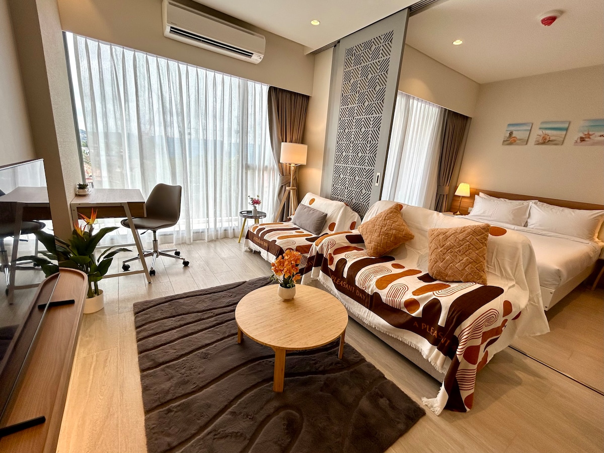 这是一间位于卡伦(Karon)海滩附近的全新现代公寓,距离海滩仅约 800 米(步行 10 分钟),位置优越,生活便利。这里是普吉岛西南岸最受欢迎、又相对宁静的度假区域之一,非常适合想要放松、享受海岛风情的旅客。 公寓面积约 35 平方米,为单间设计,风格现代简约,配有 高速无线网络,入住后水、电、网络均已包含,无需额外付费。 房间配备齐全的厨房设施——冰箱、微波炉、电磁炉等,可自行烹饪。 入住时我们还贴心准备了矿泉水与一些洗漱用品,让您拎包即可入住。 公寓楼设施完善,设有 两座屋顶无边泳池、健身房 以及 餐厅,您可以在泳池边欣赏卡伦海滩的壮丽景色,享受惬意的度假时光。 📍 位置与周边景点 🚶♀️ 卡伦海滩:约 800 米,步行 10 分钟 🚗 卡塔海滩:约 5 分钟车程(2.5 公里) 🚗 芭东海滩:约 10 分钟车程(6 公里) 🚗 查龙寺:约 15 分钟车程 🚗 大佛 :约 20 分钟车 🚗 普吉镇:约 25 分钟车程 区域内餐厅便利店、按摩店和夜市齐全,生活与娱乐十分方便。