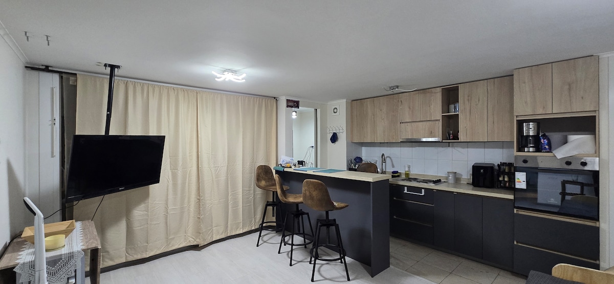 Temuco'nun kalbinde modern bir stüdyo dairede konaklamanızın tadını çıkarın. Av. Alemania'ya birkaç adım mesafede, kafeler, barlar, Portal alışveriş merkezi, klinikler, üniversiteler ve Casino Dreams ile çevrilidir. Özel olarak iki kişi için tasarlanmıştır, donanımlı bir mutfağı, ev ofisi için ideal WiFi'si, özel banyosu ve balkonu vardır. Kapı görevlisinin önünde park yeri, uygunluk durumuna bağlıdır. 7/24 kontrollü erişim, yakınlık, konfor ve tarz. Sizi bekliyoruz!